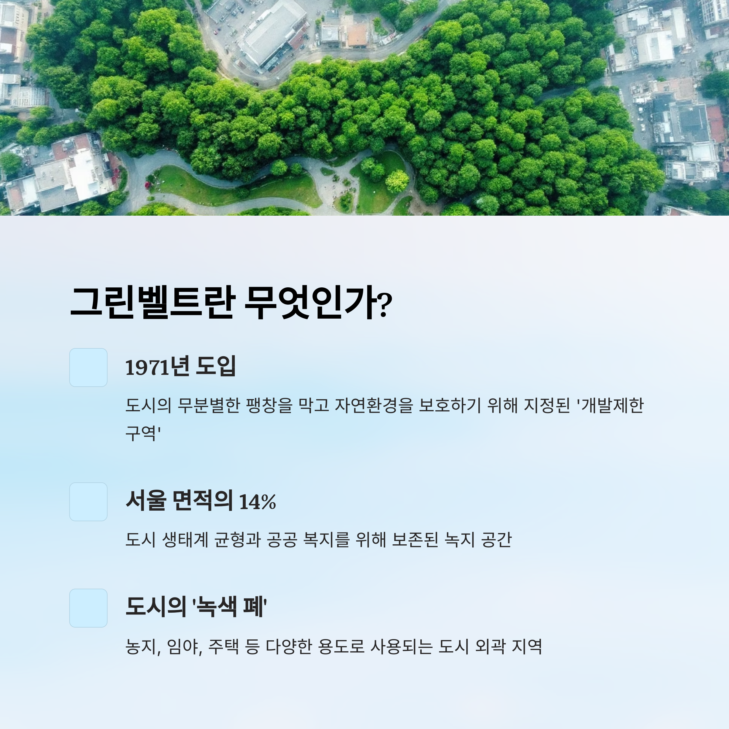 | 1971년 | 서울 첫 그린벨트 지정 | 무분별한 개발 억제 |
