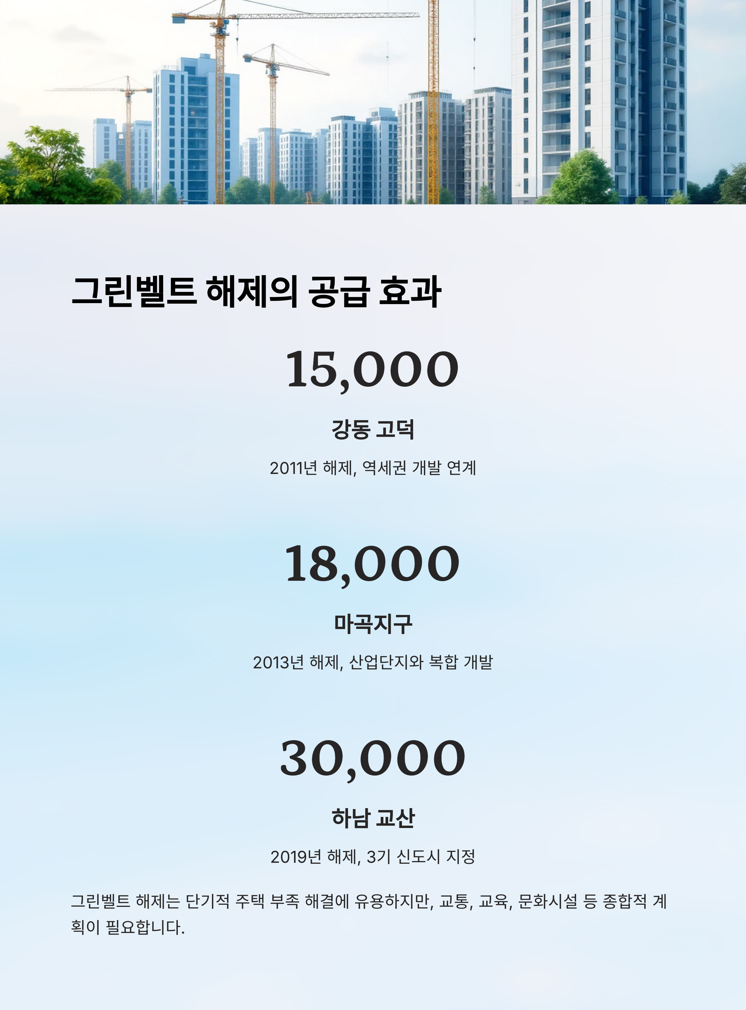 이처럼 그린벨트 해제를 통한 공급은 단기적 주택 부족 해결에 있어 상당히 유용한 수단이에요. 하지만 중장기적으로는 교통, 교육, 문화시설까지 포함한 정비 계획이 병행되어야 실질적인 주거환경 개선으로 이어질 수 있어요.