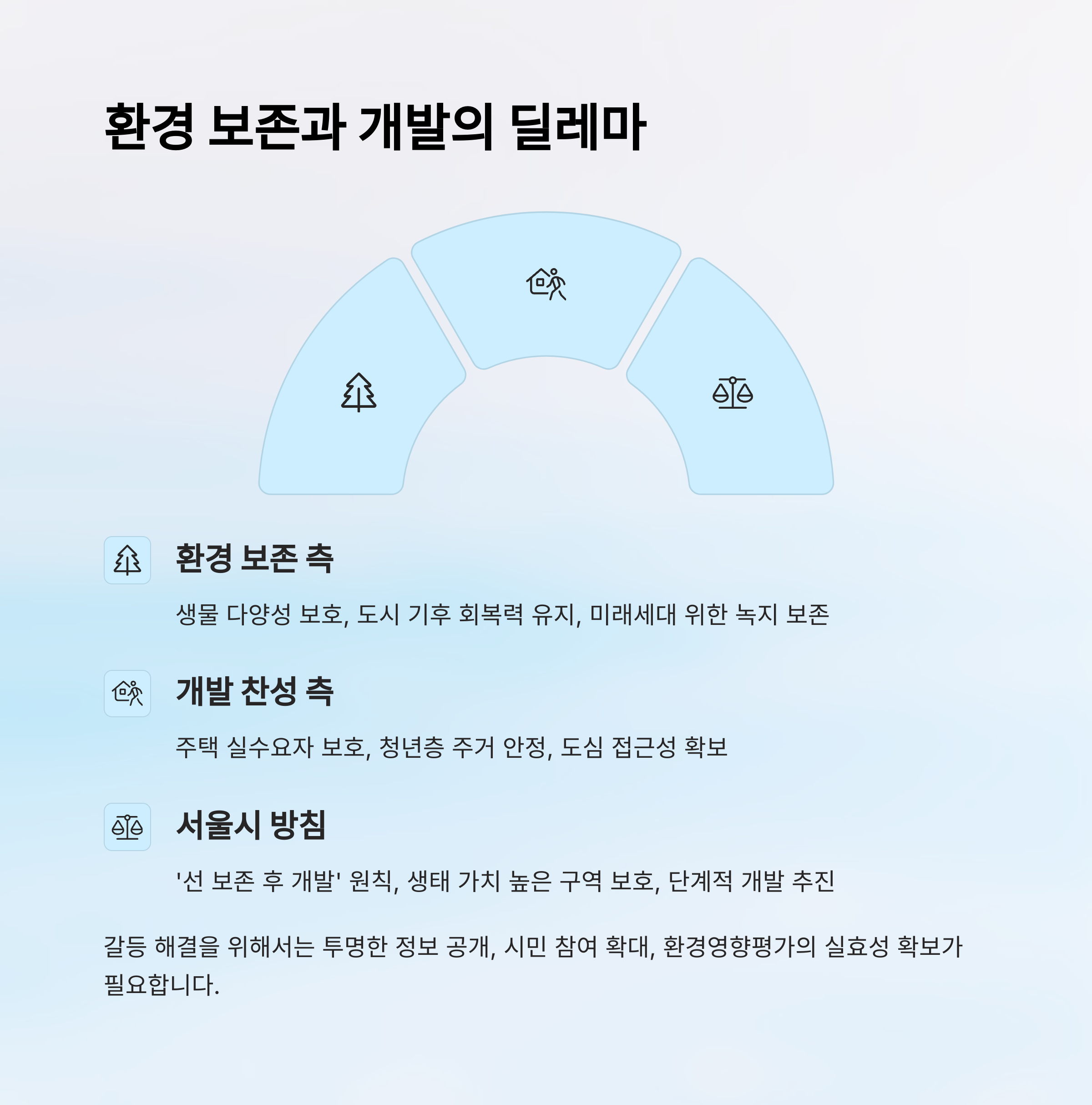 서울시는 이런 갈등을 줄이기 위해 '선 보존 후 개발' 원칙을 세우고 있어요. 생태 가치가 높은 구역은 보호하고, 상대적으로 환경성이 낮고 접근성이 좋은 곳부터 단계적으로 개발하겠다는 계획이에요. 환경평가 제도도 강화되고 있어요.