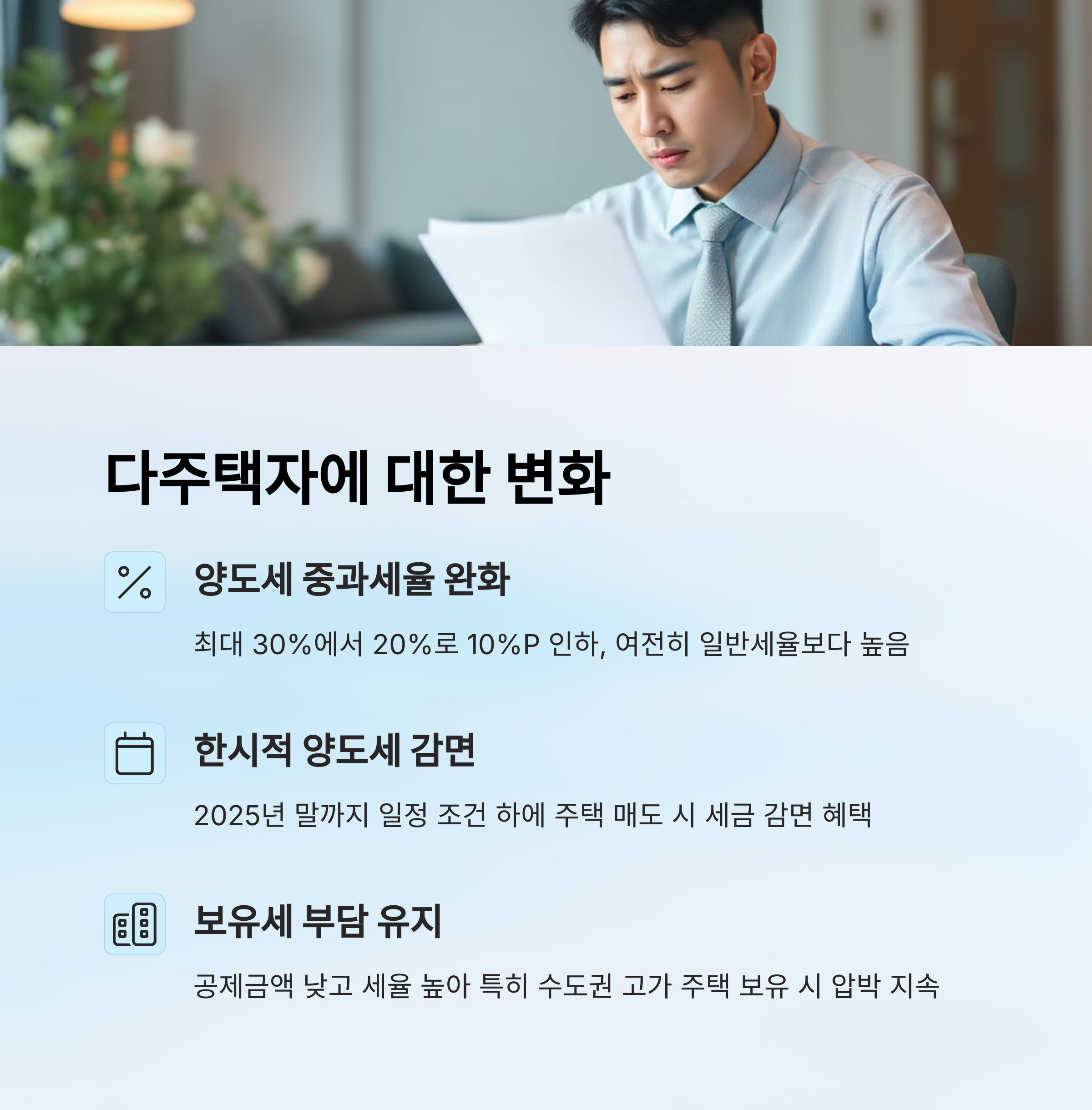 2025년 세제 개편에서 다주택자에게는 여전히 부담스러운 세금 체계가 유지되지만, 일부 완화된 부분도 있어요. 특히 기존보다 다주택자 처우가 조금 유연해졌다는 점에서 투자자들의 움직임이 바뀌고 있어요.