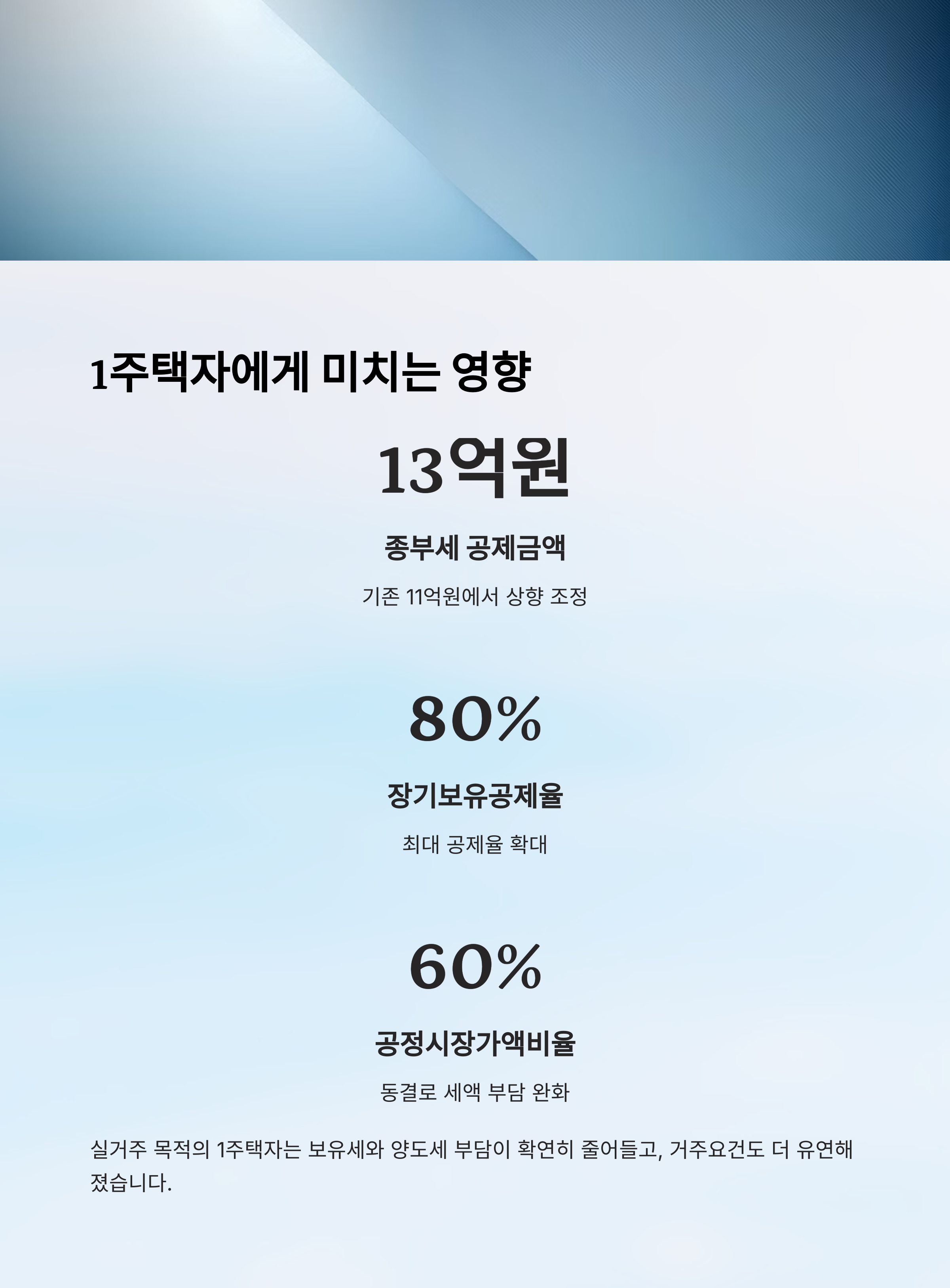 | 종부세 공제 | 11억 → 13억 상향 | 1세대 1주택자 |