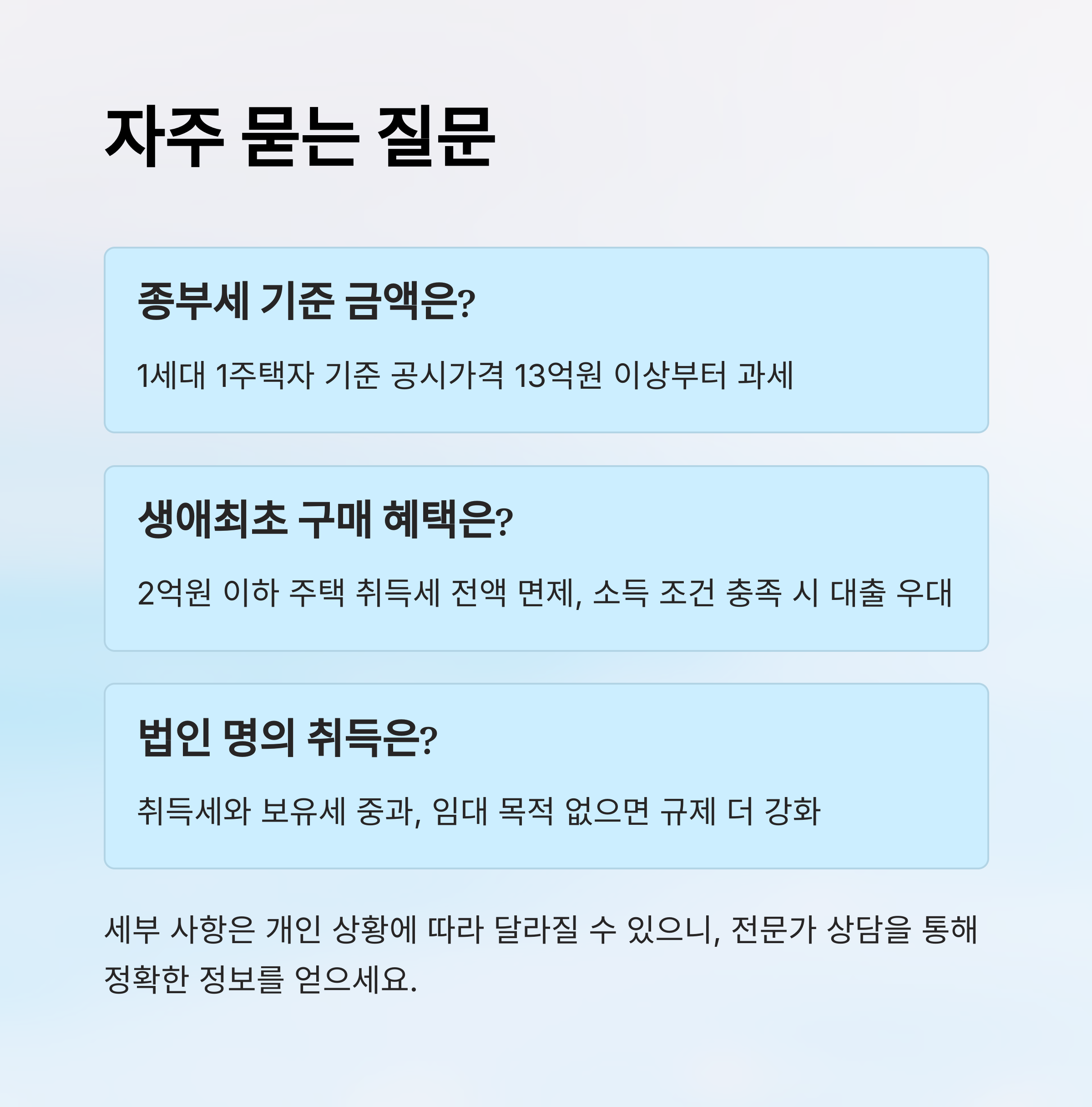 A1. 2025년 기준으로 1세대 1주택자의 종부세 과세 기준은 공시가격 13억 원 이상이에요. 13억 원 이하 주택은 종부세 대상이 아니에요.