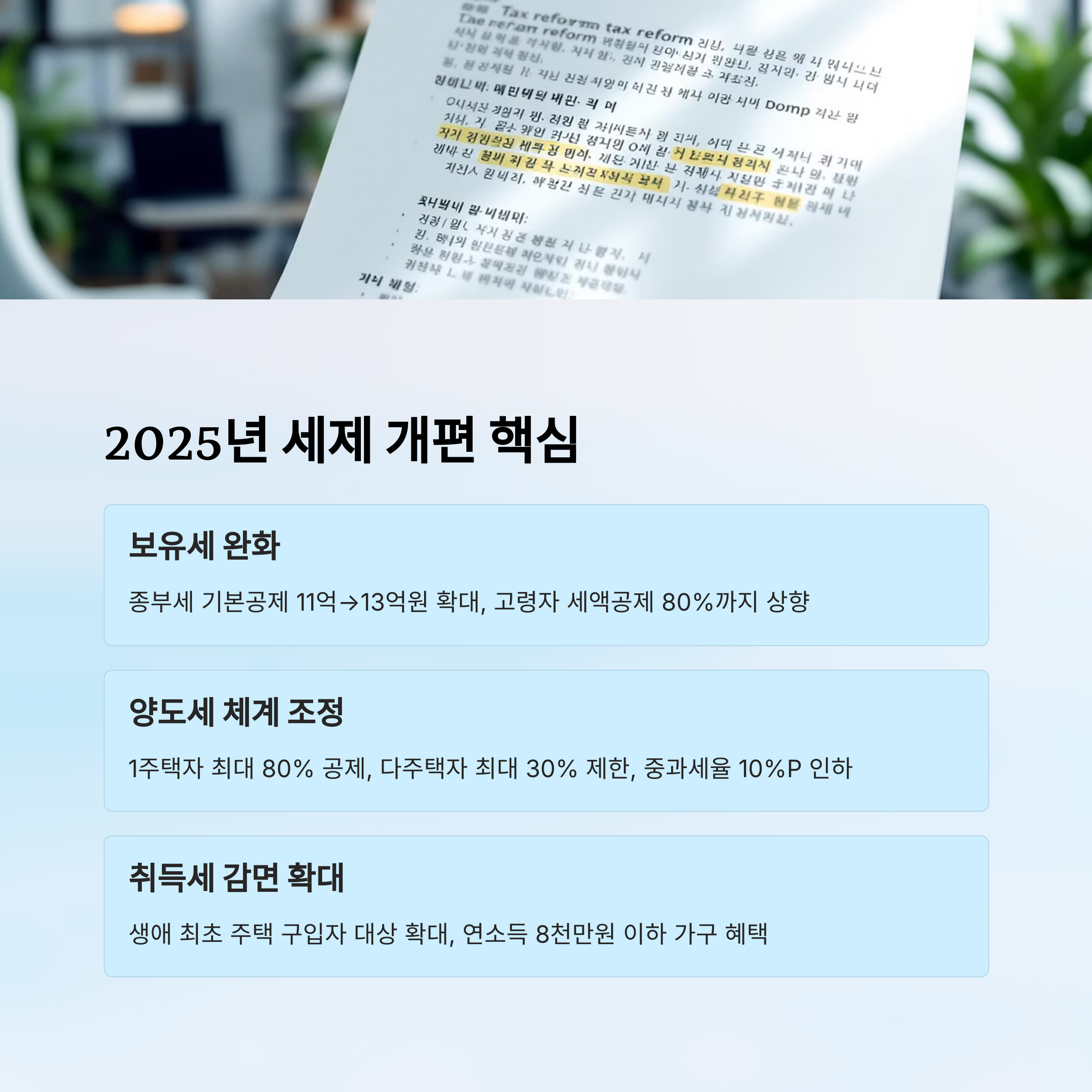 2025년 부동산 세제 개편은 1주택자에게 긍정적인 방향으로 설계되었어요. 실거주 목적의 1주택 보유자에게는 보유세와 양도세 부담이 확연히 줄어들었고, 공제 항목이 대폭 강화되었기 때문에 ‘내 집 마련’에 대한 부담도 줄어든 셈이에요.