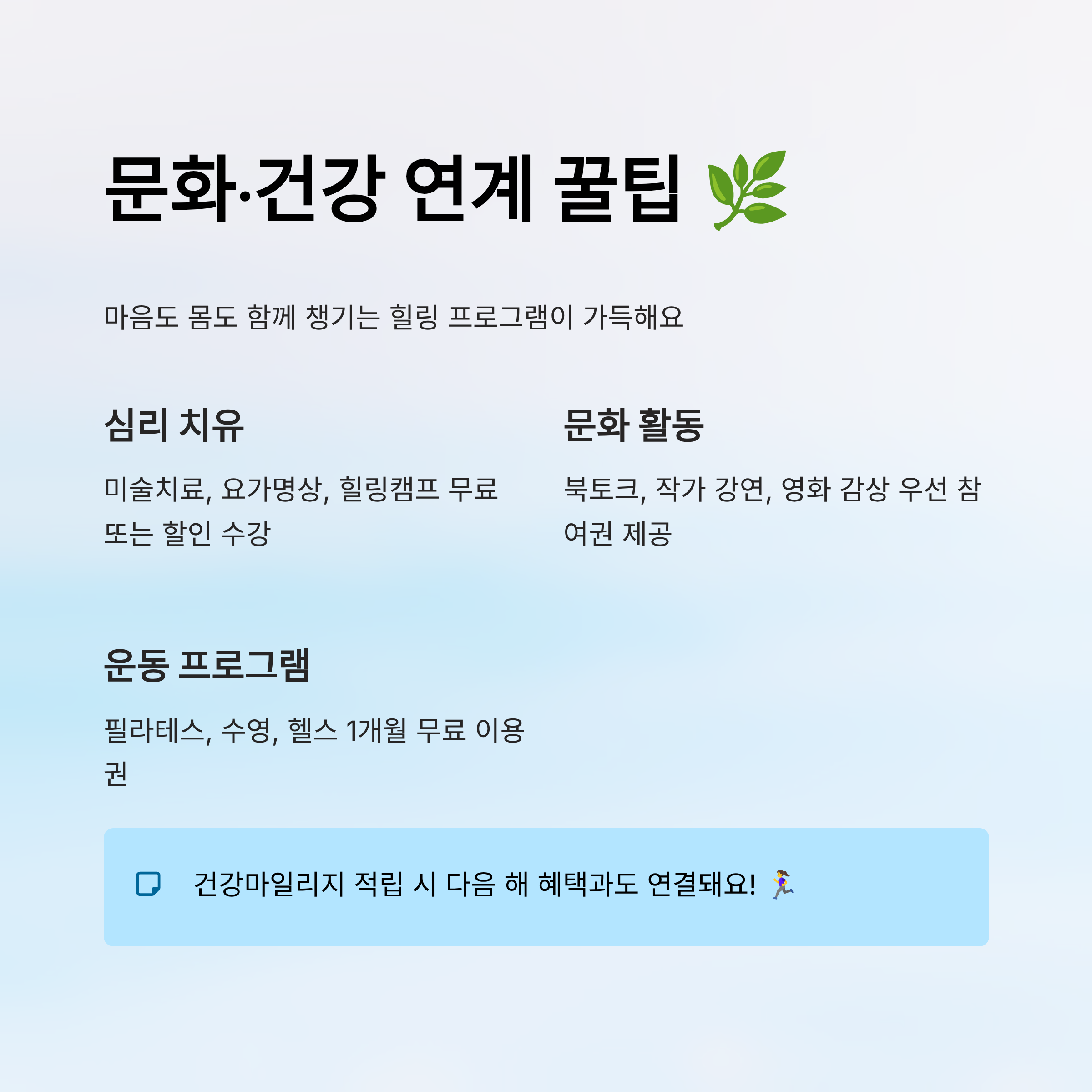 마음도 건강도 동시에 챙기고 싶다면 이런 연계 혜택을 적극 활용해보세요! 놓치면 아까운 플러스 알파 혜택들이 여러분을 기다리고 있답니다. 😊