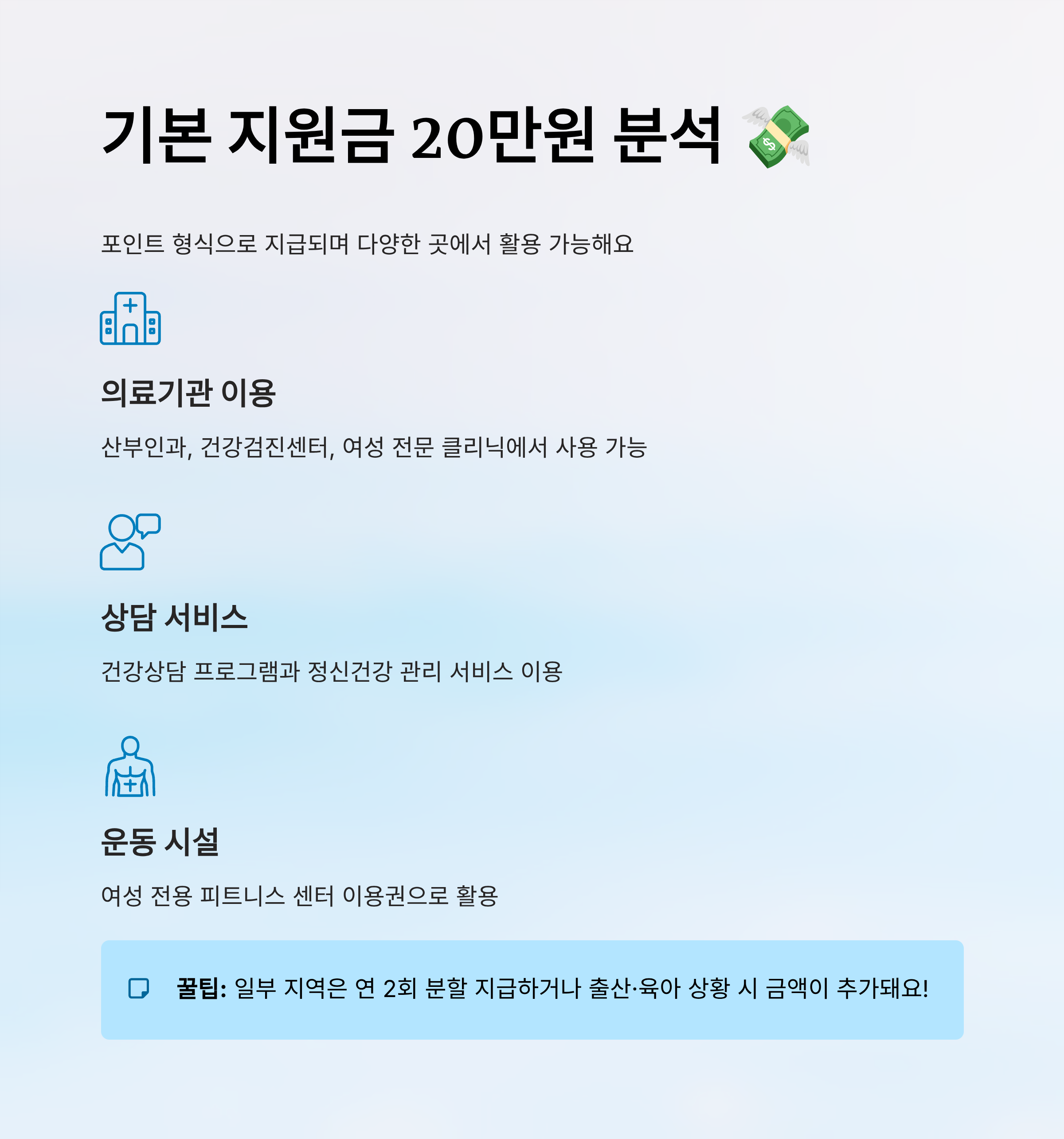특히 일부 지역에서는 1회가 아닌 연 2회까지 분할 지급되거나, 출산·육아 상황과 연계해서 지급 금액이 더 늘어나는 경우도 있어서 자세히 알아두면 좋아요. 20만원이라는 금액이 작게 느껴질 수 있지만, 알차게만 사용하면 그 이상 가치를 충분히 끌어낼 수 있답니다! 🧾