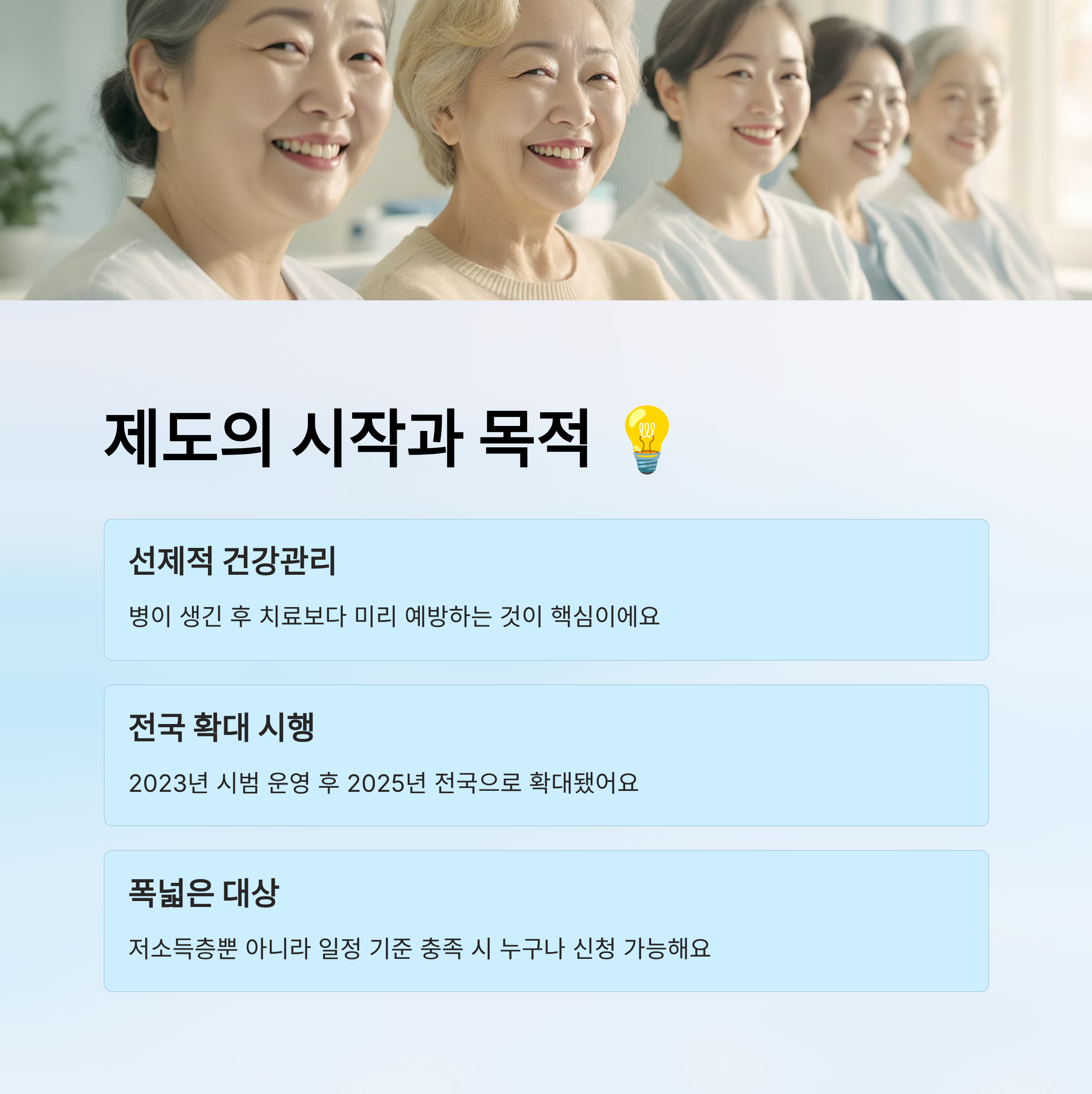 2023년 시범적으로 시행된 이 정책은 큰 반향을 일으켰고, 2025년에는 전국 확대로 이어졌어요. 정책의 핵심은 ‘선제적 건강관리’예요. 즉, 병이 생긴 뒤 치료하기보다는 미리 체크하고 예방하자는 개념이죠. 그리고 그 과정에서 재정적 부담 없이 지원을 받을 수 있다는 게 가장 큰 장점이에요.