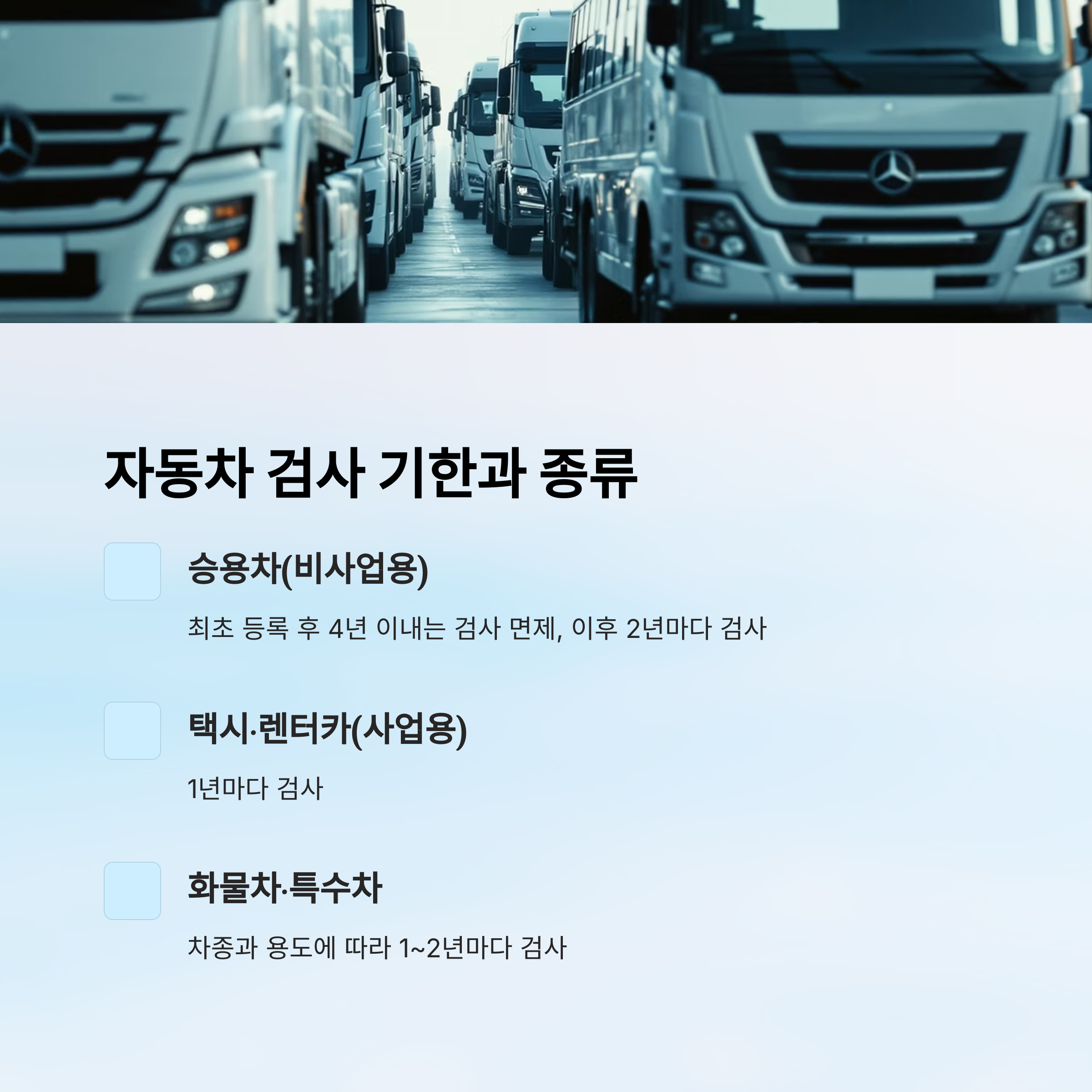 🚗 승용차(비사업용): 최초 등록 후 4년 이내는 검사 면제, 이후 2년마다 검사 🚕 택시·렌터카(사업용): 1년마다 검사 🚛 화물차·특수차: 차종과 용도에 따라 1~2년마다 검사