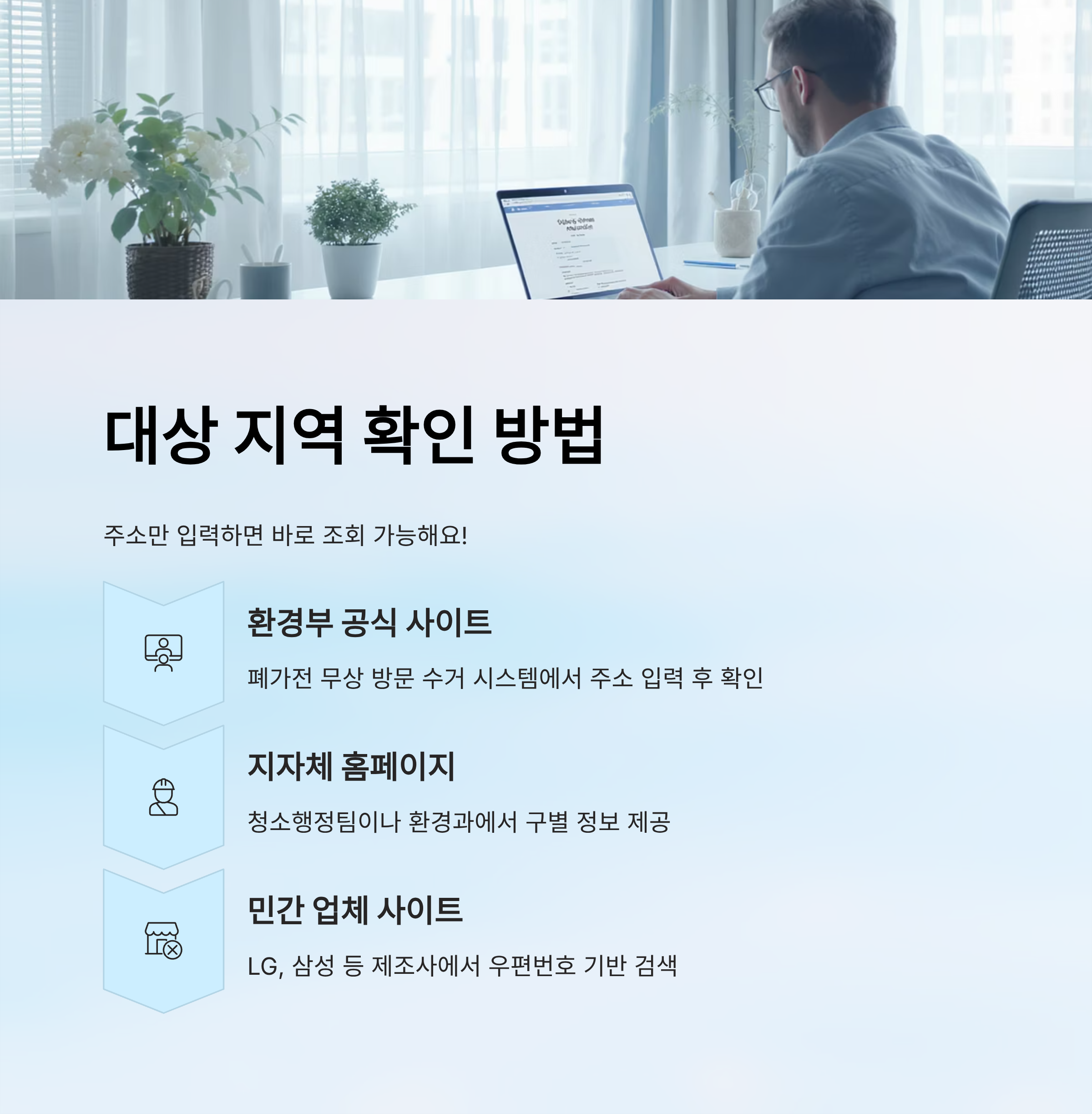 3️⃣ 마지막으로, 민간 업체 홈페이지에서 우편번호 기반 주소 검색 기능을 제공하는 경우도 있어요. 예) 쿠쿠전자, LG전자, 삼성전자, 하이마트 등에서 신제품을 구매할 때 수거 연계 여부를 확인 가능하답니다.