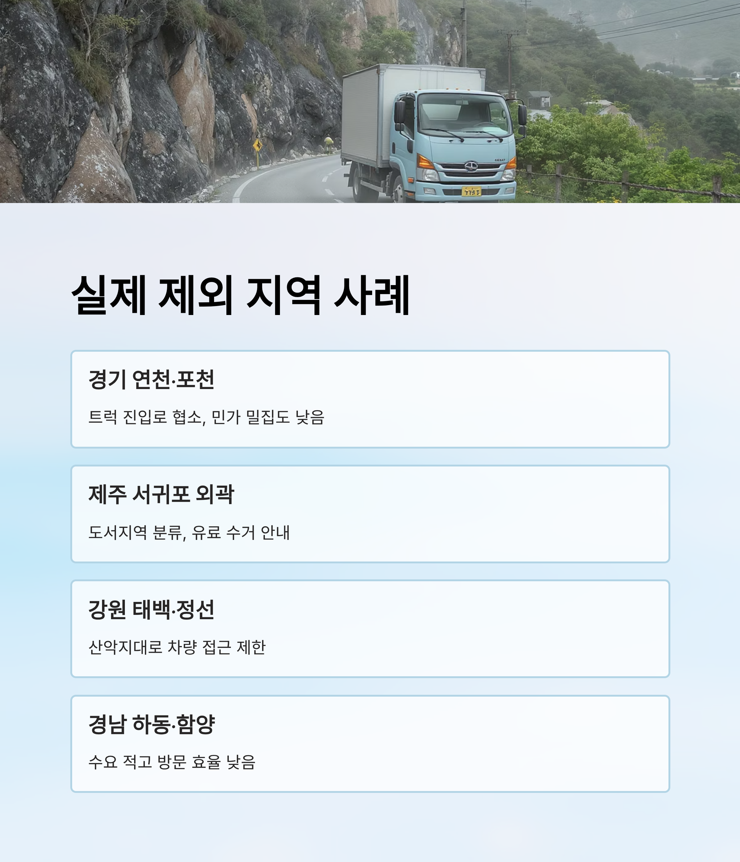 📌 경기도 연천, 포천 일부 지역: 수거 업체 접근 불가 지역. 트럭 진입로가 협소하거나 민가 밀집도가 낮아 인력 운용이 어려움.