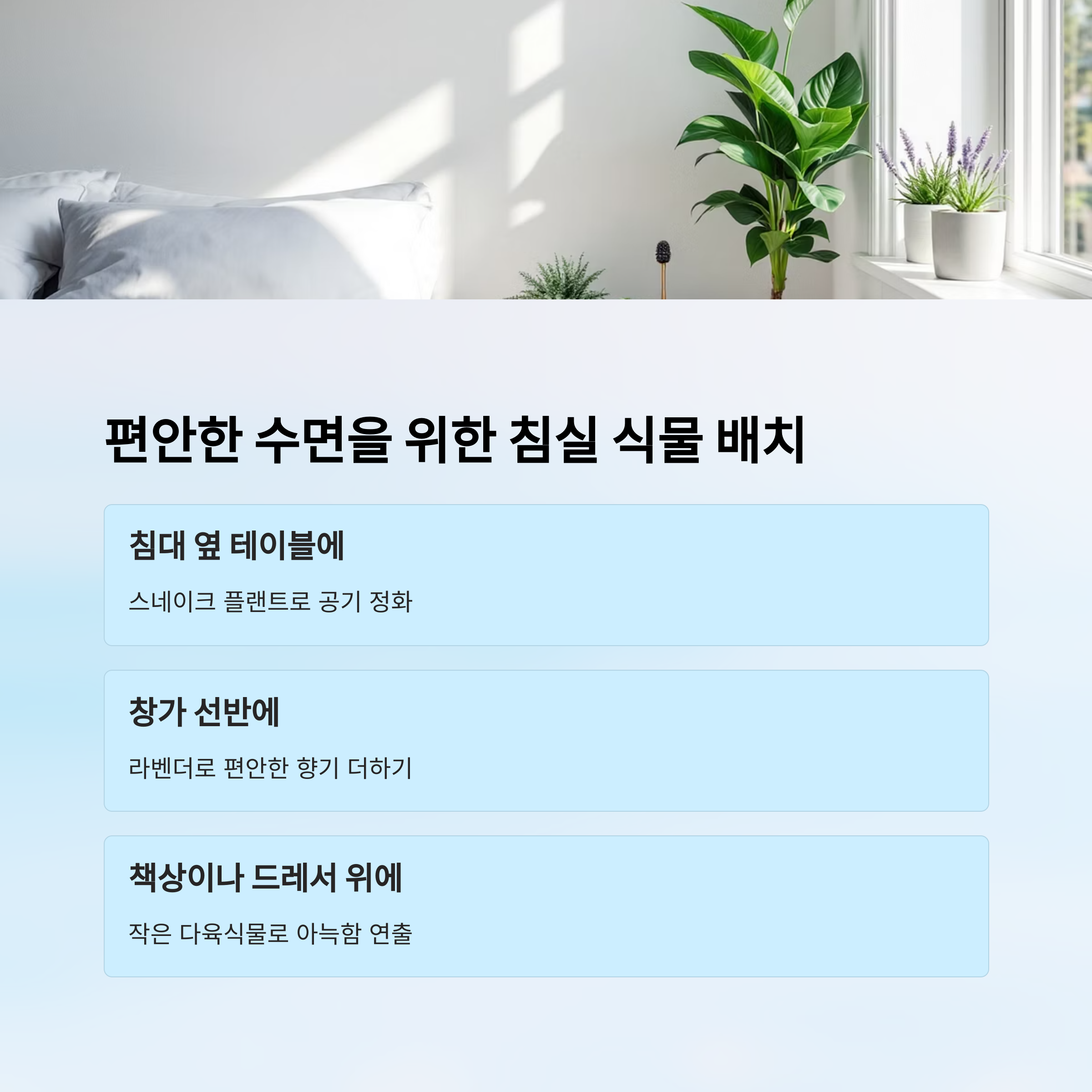 | 침실 | 산세베리아, 보스톤 고사리, 라벤더 |