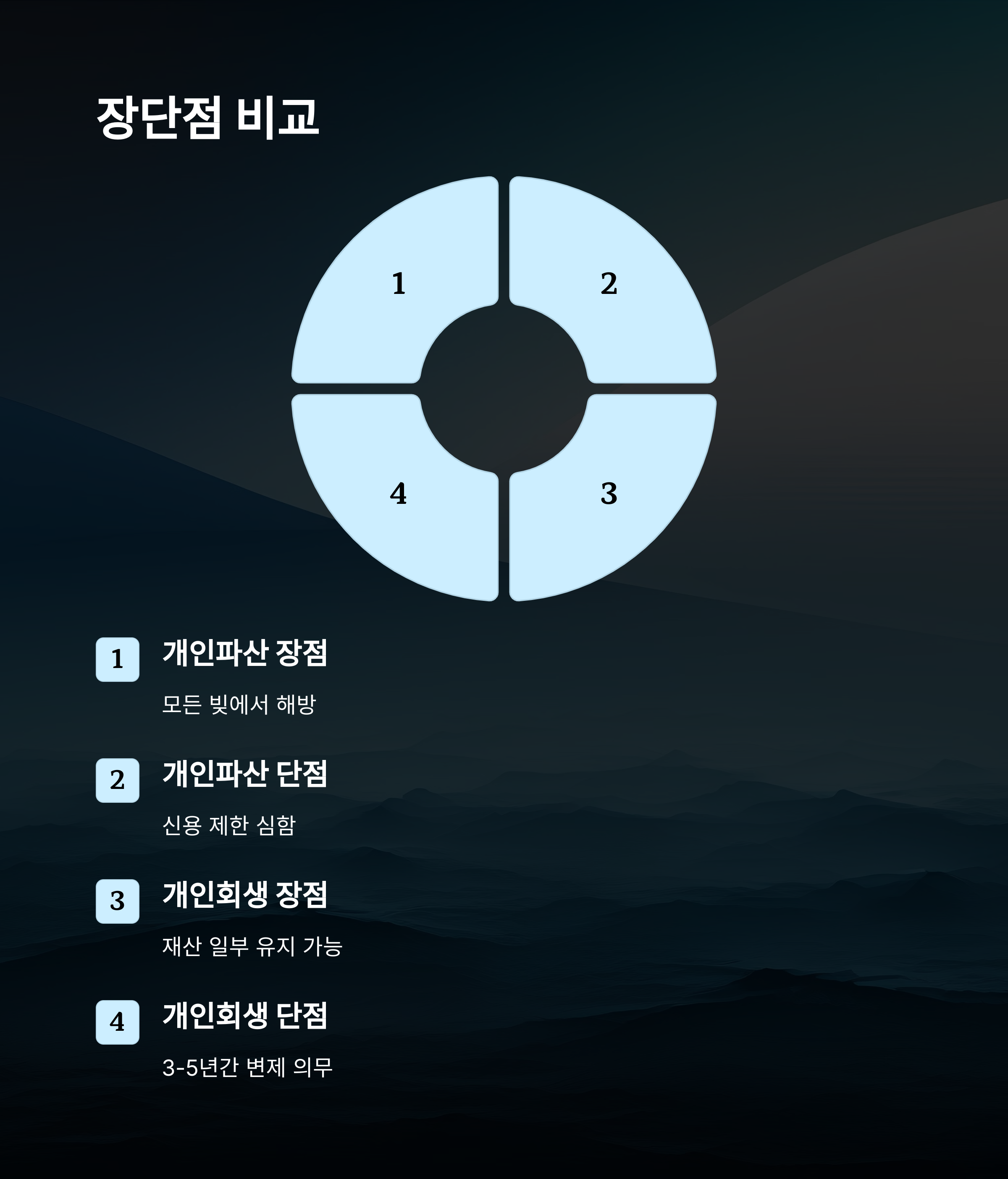 | 개인파산 | 채무 완전 면제, 독촉 중단 | 신용등급 하락, 취업 제한 |