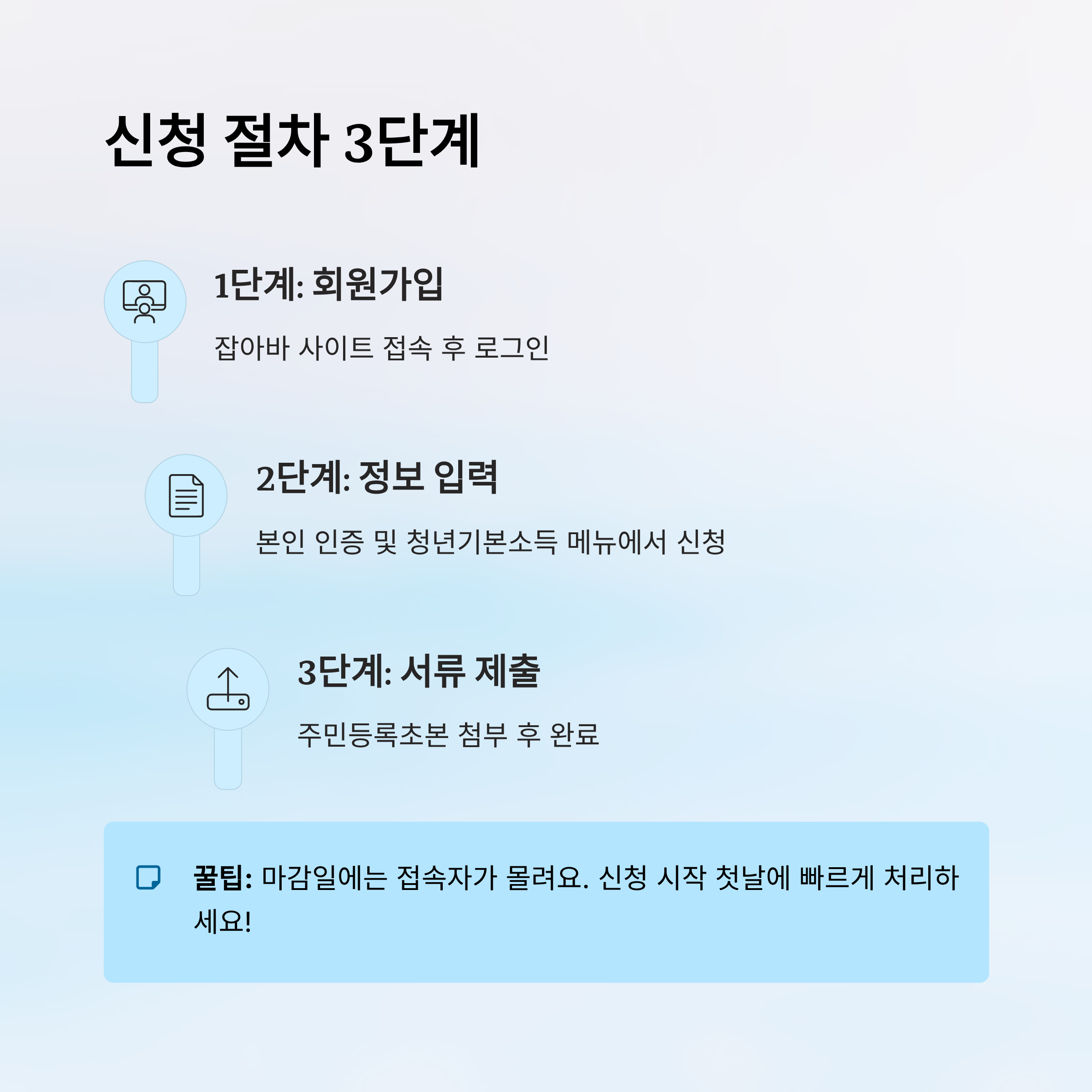 1단계는 사이트 회원가입 및 로그인, 2단계는 청년기본소득 메뉴에서 본인 인증 및 정보 입력이에요. 마지막으로 주민등록초본 첨부만 하면 완료되죠. 기초생활수급자인 경우 수급자 증명서도 첨부해야 해요.