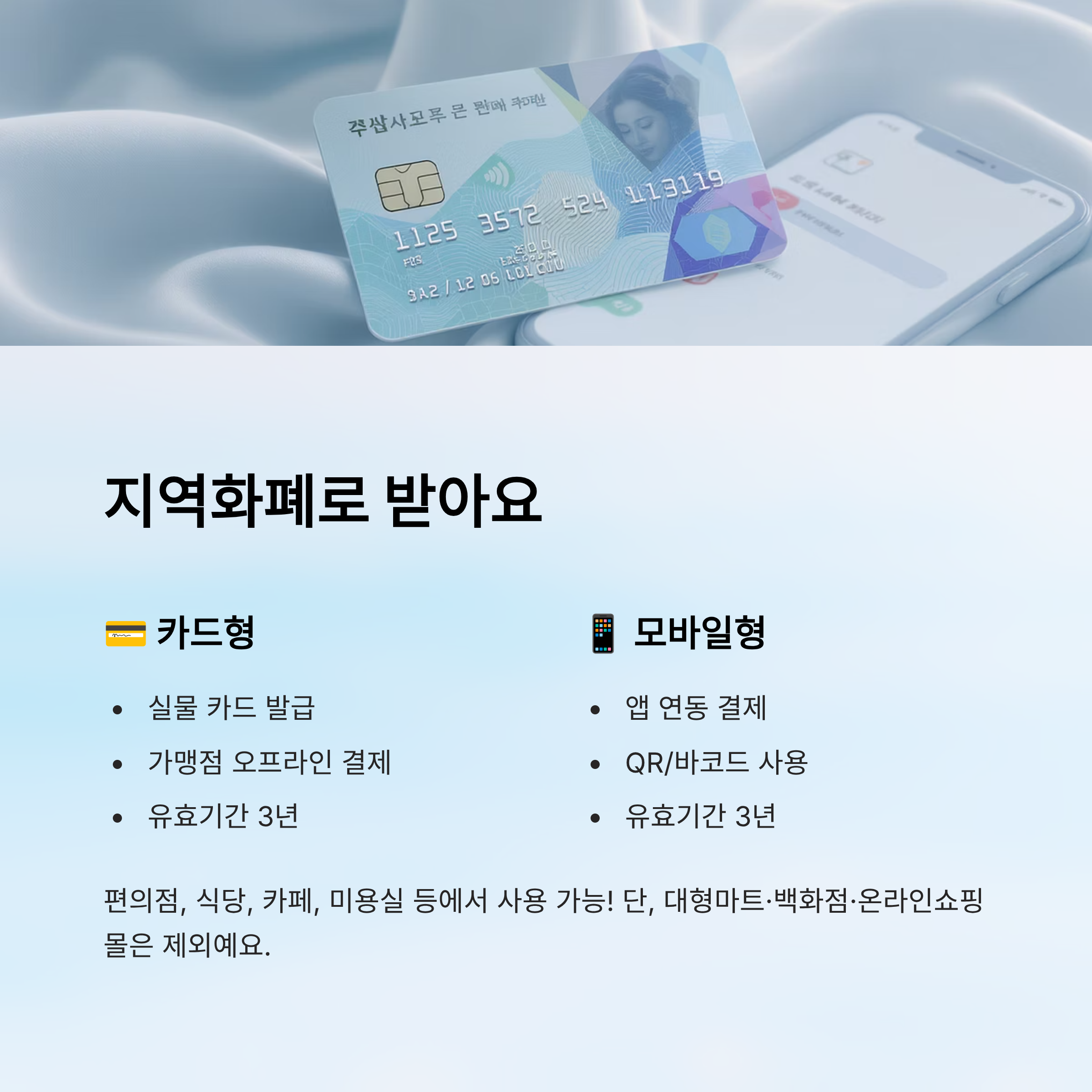 청년기본소득은 전액 지역화폐로 지급돼요. 시·군별로 카드형 또는 모바일형으로 나뉘며, 신청자의 주소지에 따라 발급 형태가 정해져요. 예를 들어 수원시에서는 카드형, 남양주시는 모바일형이 많아요.