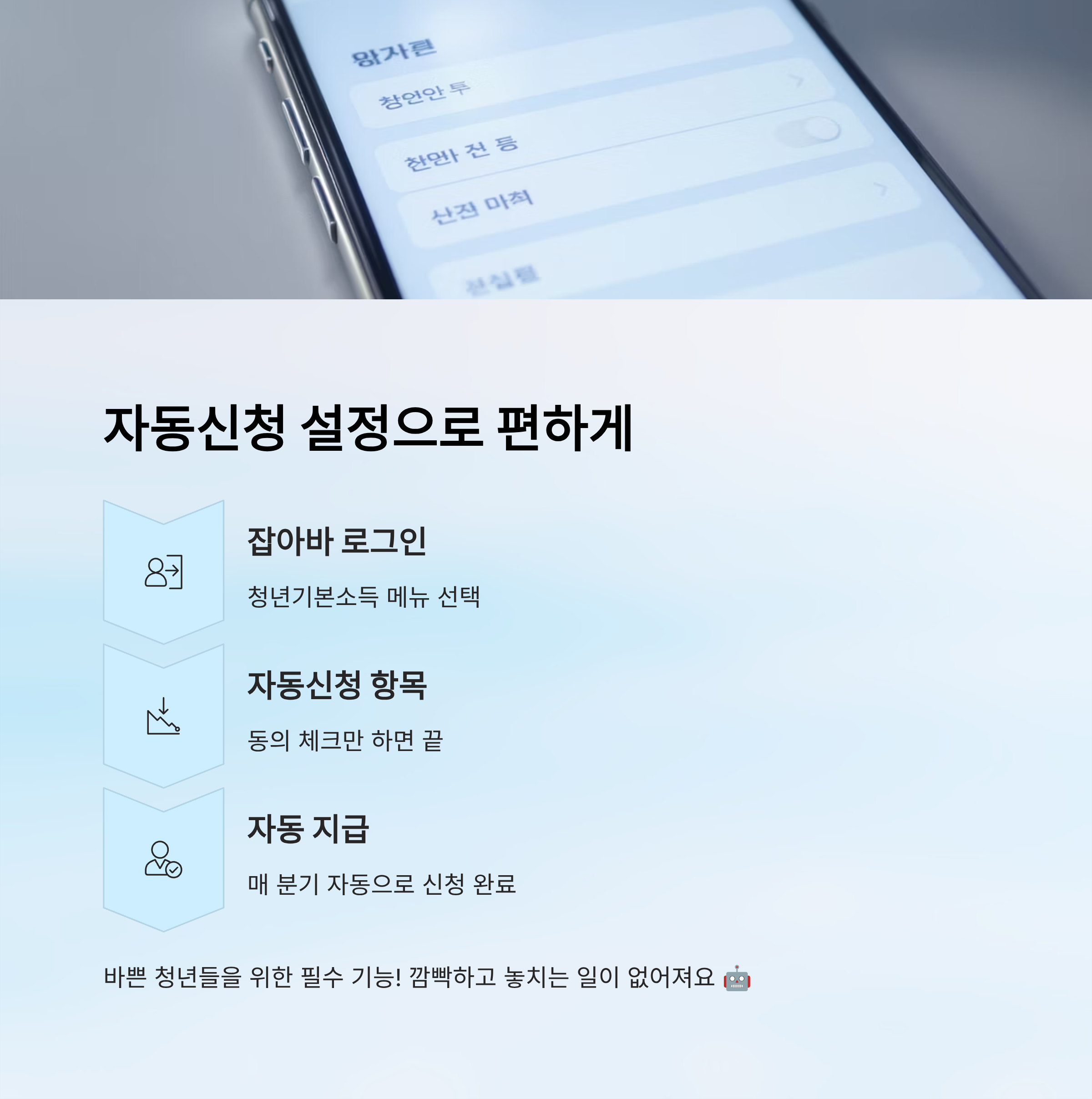 설정 방법은 간단해요. 잡아바 로그인 → 청년기본소득 메뉴 → 자동신청 항목 선택 → 동의 체크만 하면 끝이에요. 이후 자격 심사와 지급 절차가 알아서 진행돼요. 정말 신세계✨