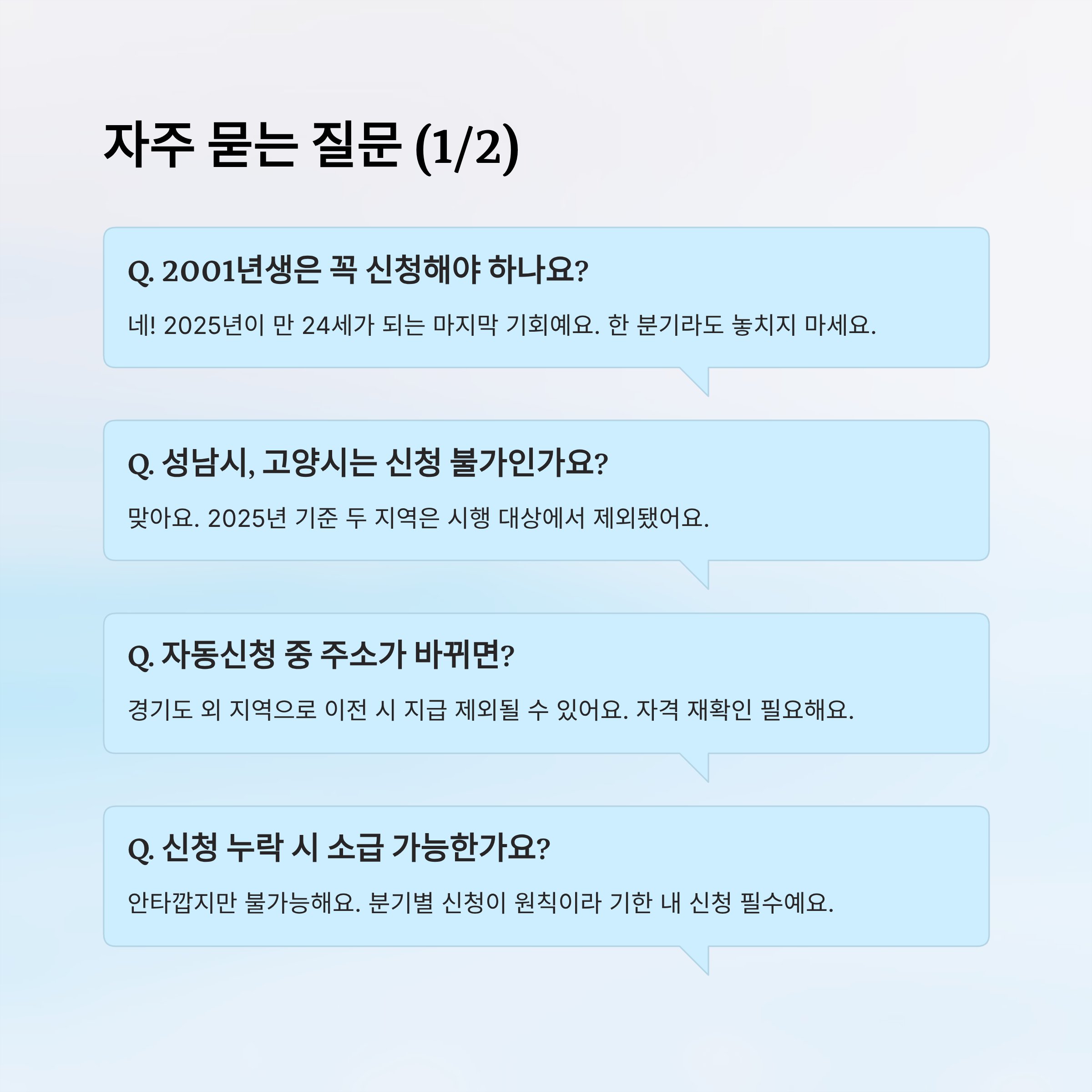 예를 들어 2025년에는 2001년생이 해당돼요. 01년생 중 2025년 신청일 기준 위 조건을 만족하면 누구나 신청 가능하죠. 하지만 성남시와 고양시에 거주하는 청년은 올해 지급 대상에서 제외된다는 점! 꼭 체크해야 해요.