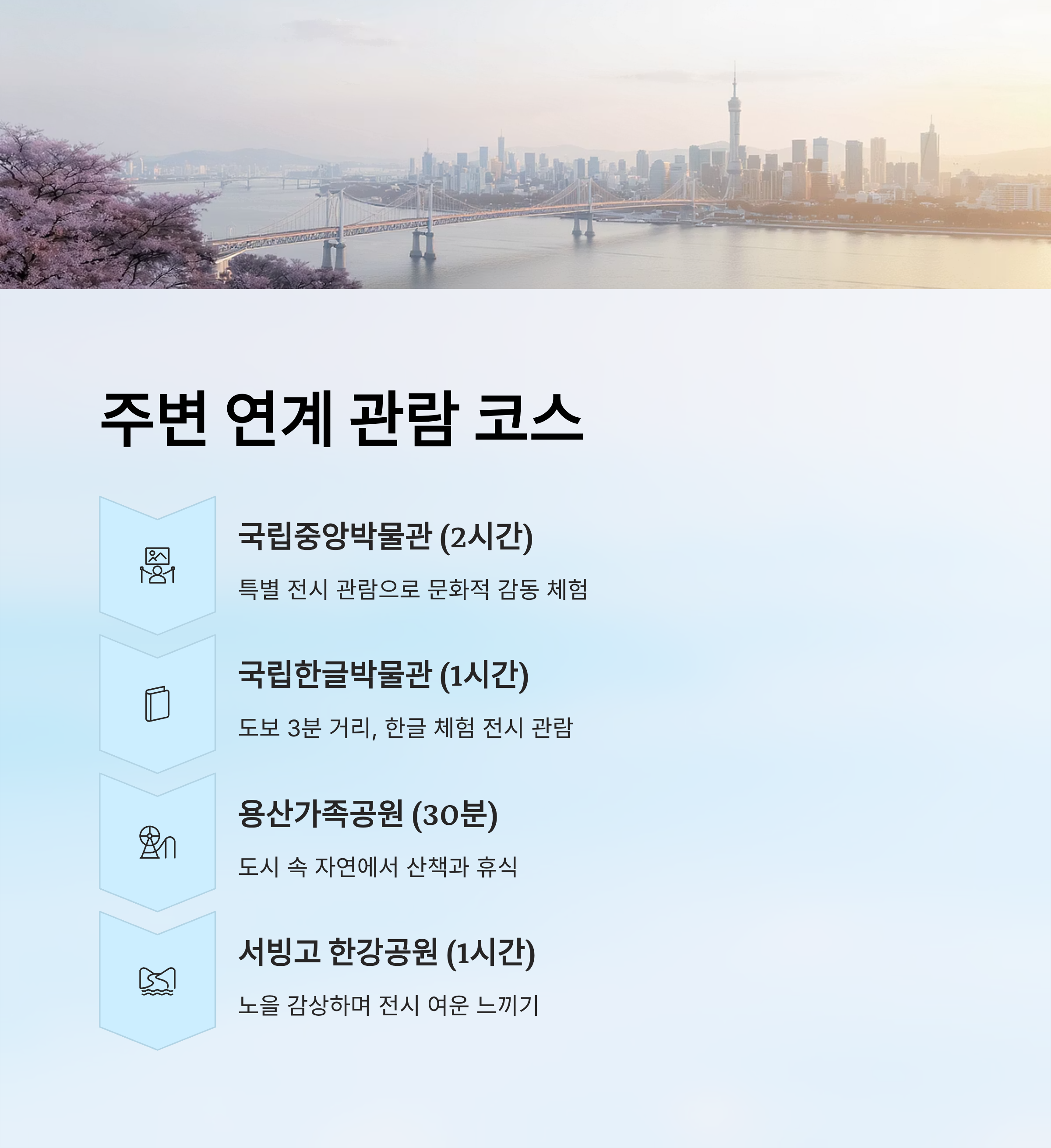 이 외에도 이태원 거리, 용산전자상가까지 확장 코스로 고려할 수 있어요. 전시와 도심 문화를 한 번에 즐길 수 있는 매력적인 지역이에요.