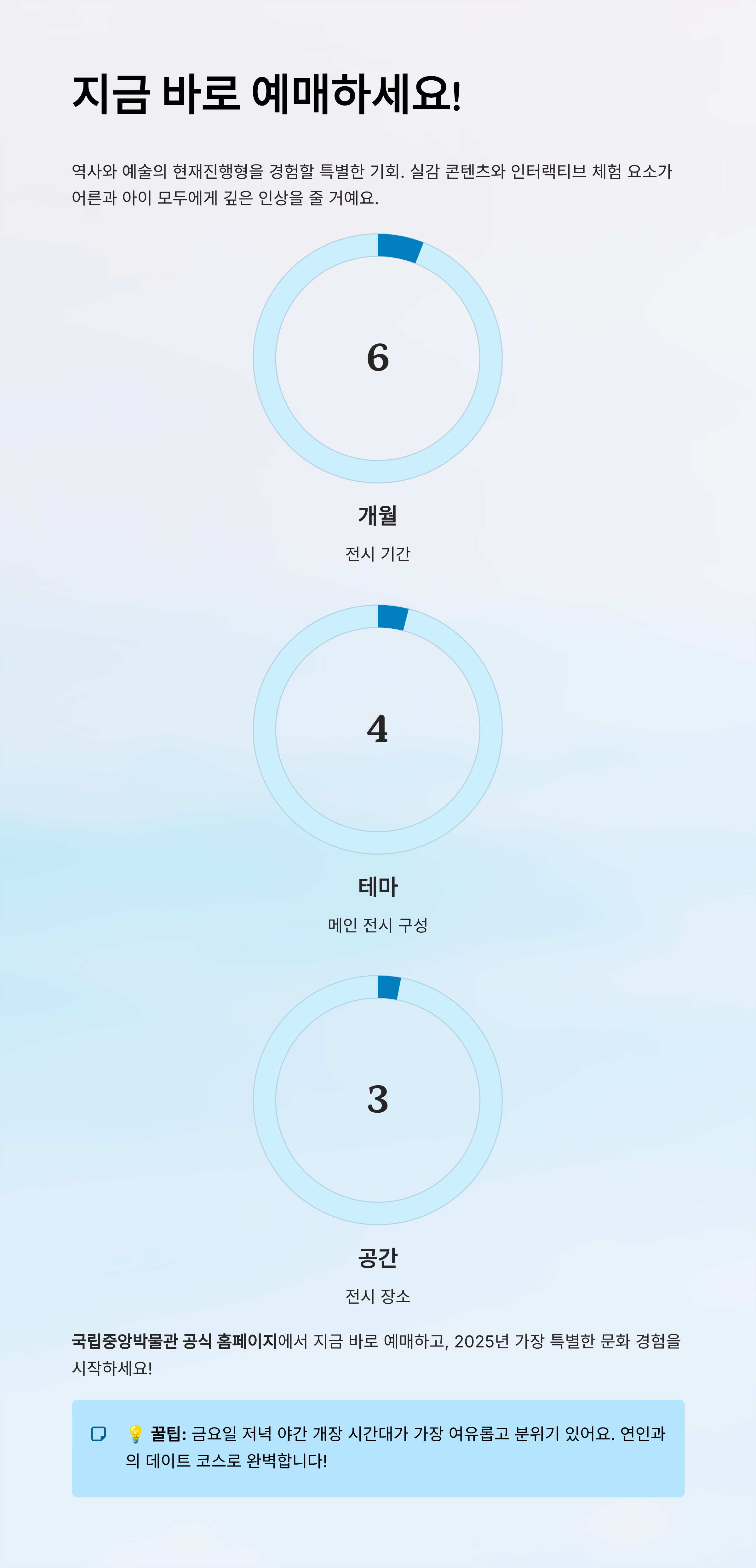 ✅ 온라인 예매 확인: 입장권은 현장 구매도 가능하지만, 인기 전시는 매진될 수 있어요. 국립중앙박물관 홈페이지 또는 전시 전용 앱에서 미리 예매하세요.