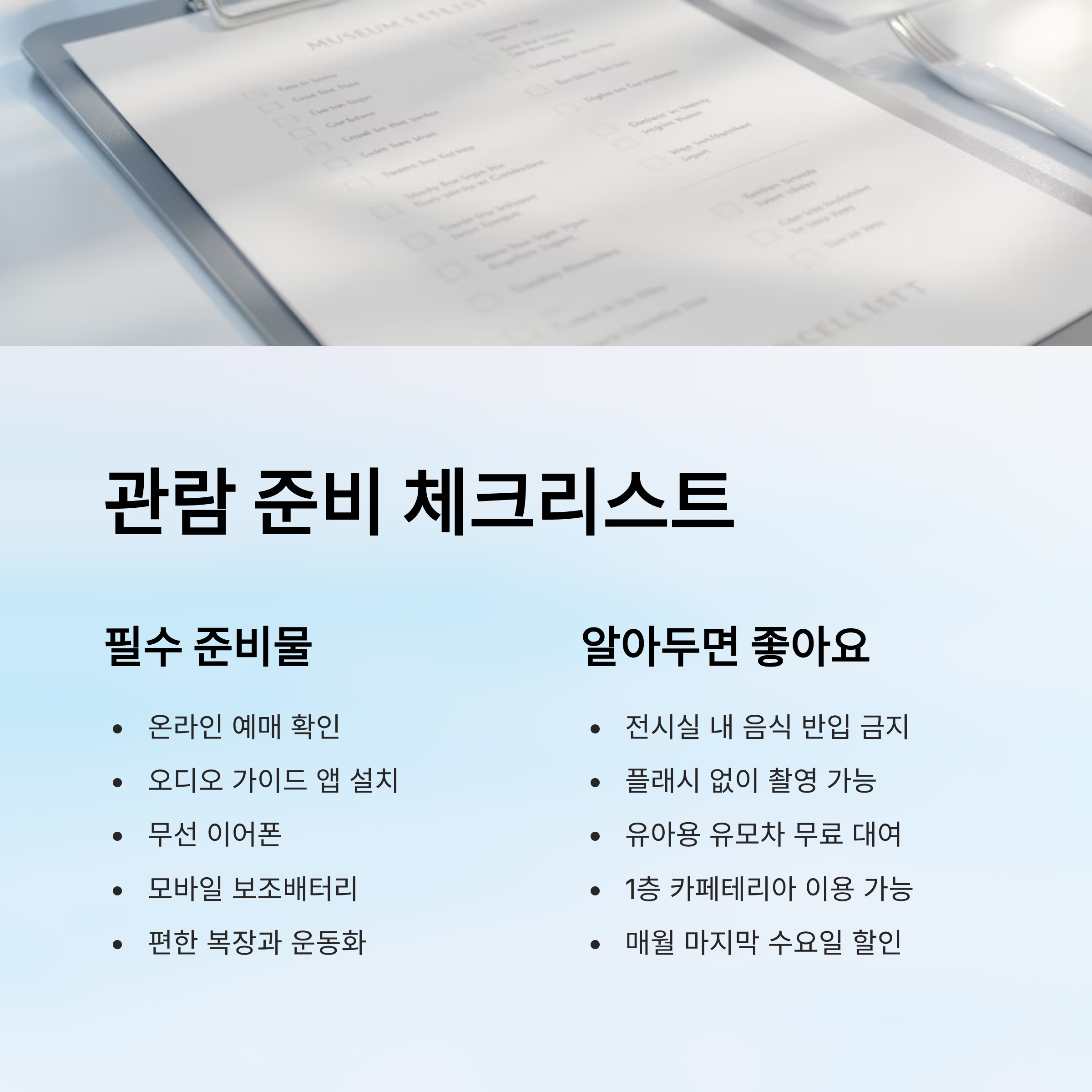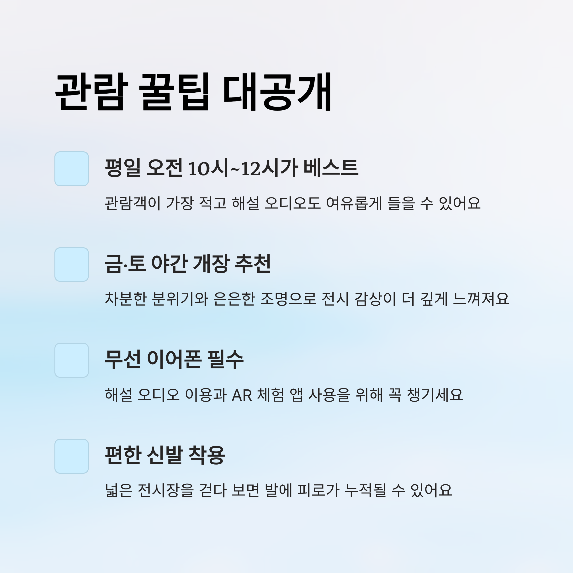 특별 전시 관람을 200% 즐기기 위해선 사전에 준비가 꼭 필요해요. 아래 체크리스트는 전시 당일 허둥대지 않고 여유롭게 즐기기 위한 꿀팁 모음이에요. ✔