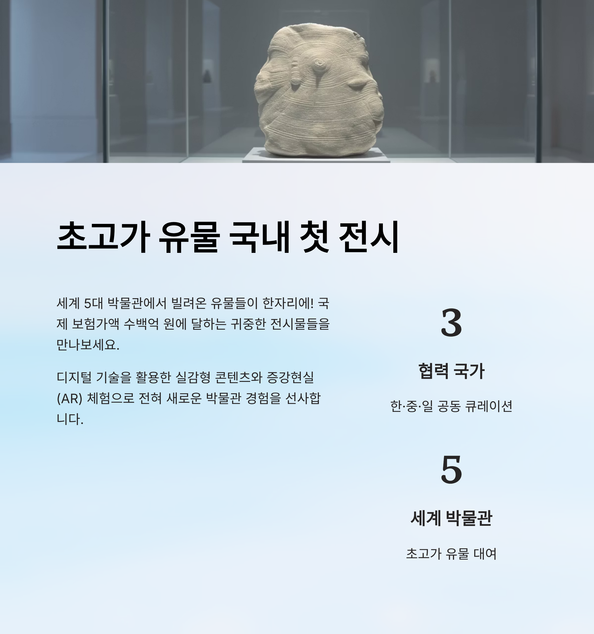 특히 눈여겨볼 부분은 세계 5대 박물관에서 빌려온 '초고가 유물'들의 국내 첫 전시예요. 이 유물들은 국제 보험가액이 수백억 원에 달하며, 유물 하나만으로도 수많은 관람객의 발걸음을 이끌고 있어요.