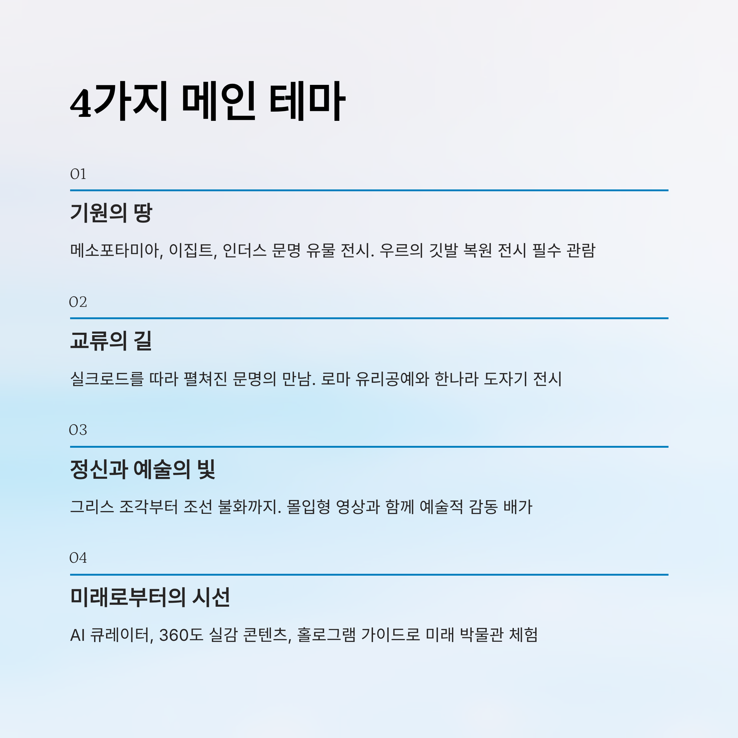 2025년 국립중앙박물관 특별 전시는 총 4개의 메인 테마로 구성되어 있어요. 각 테마는 시간의 흐름에 따라 인류가 쌓아온 문명과 그 안에서 탄생한 예술, 기술, 종교의 흔적을 다층적으로 조명해요. 전시는 단순히 ‘전시물’을 나열하지 않고, 이야기 구조로 짜여 있어 마치 한 편의 다큐멘터리를 걷는 듯한 경험을 준답니다. 📽️