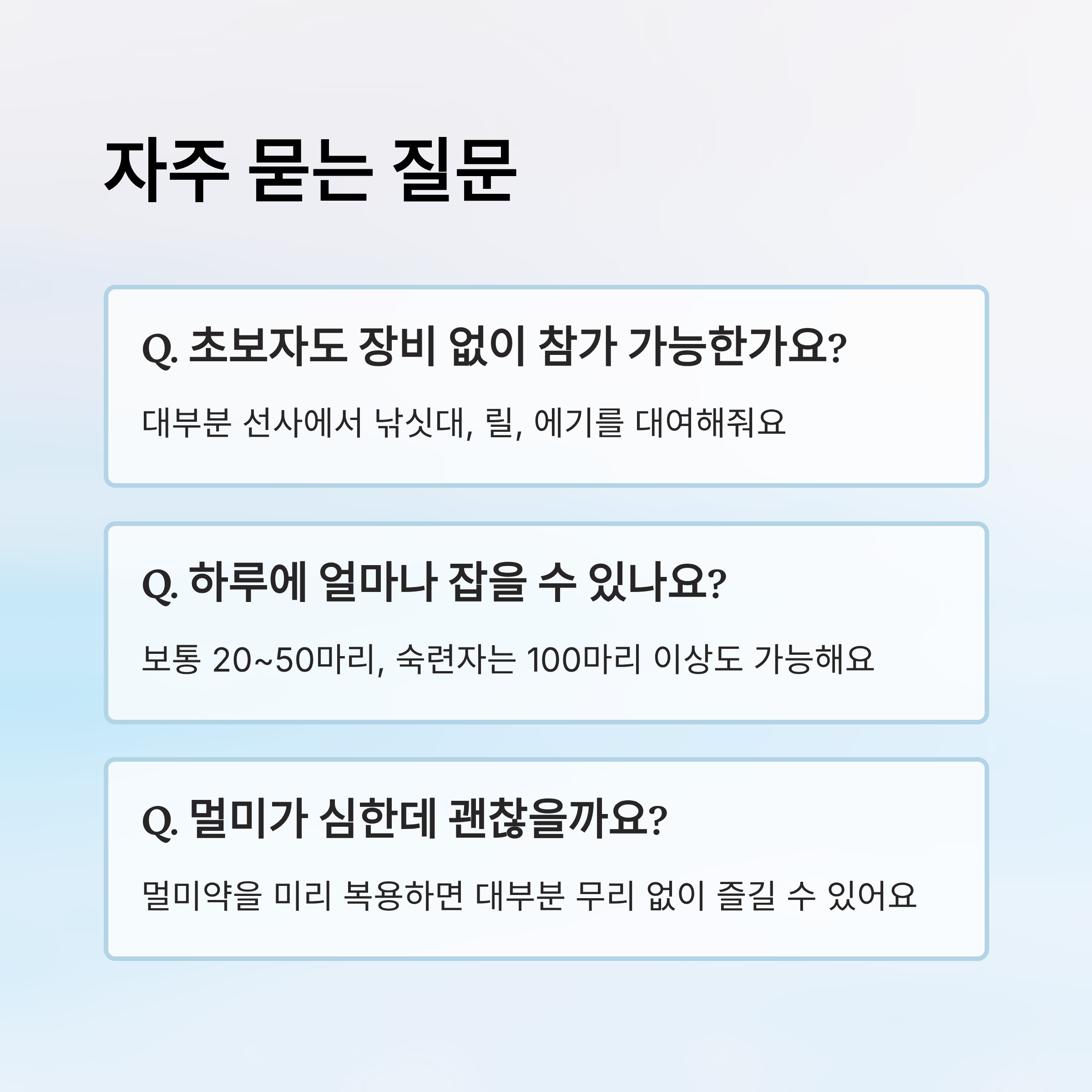 A2. 대부분의 선사에서 낚싯대, 릴, 에기를 대여해줘요. 추가 비용이 들지만 장비가 없어도 충분히 즐길 수 있어요.