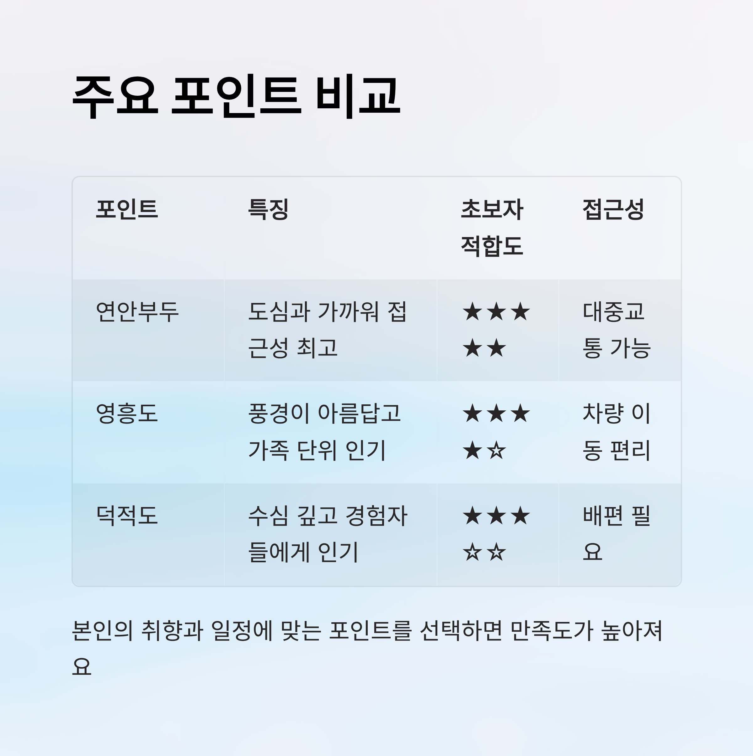 | 영흥도 | 풍경이 아름답고 가족 단위 인기 | ★★★★☆ | 상 | 차량 이동 편리 |