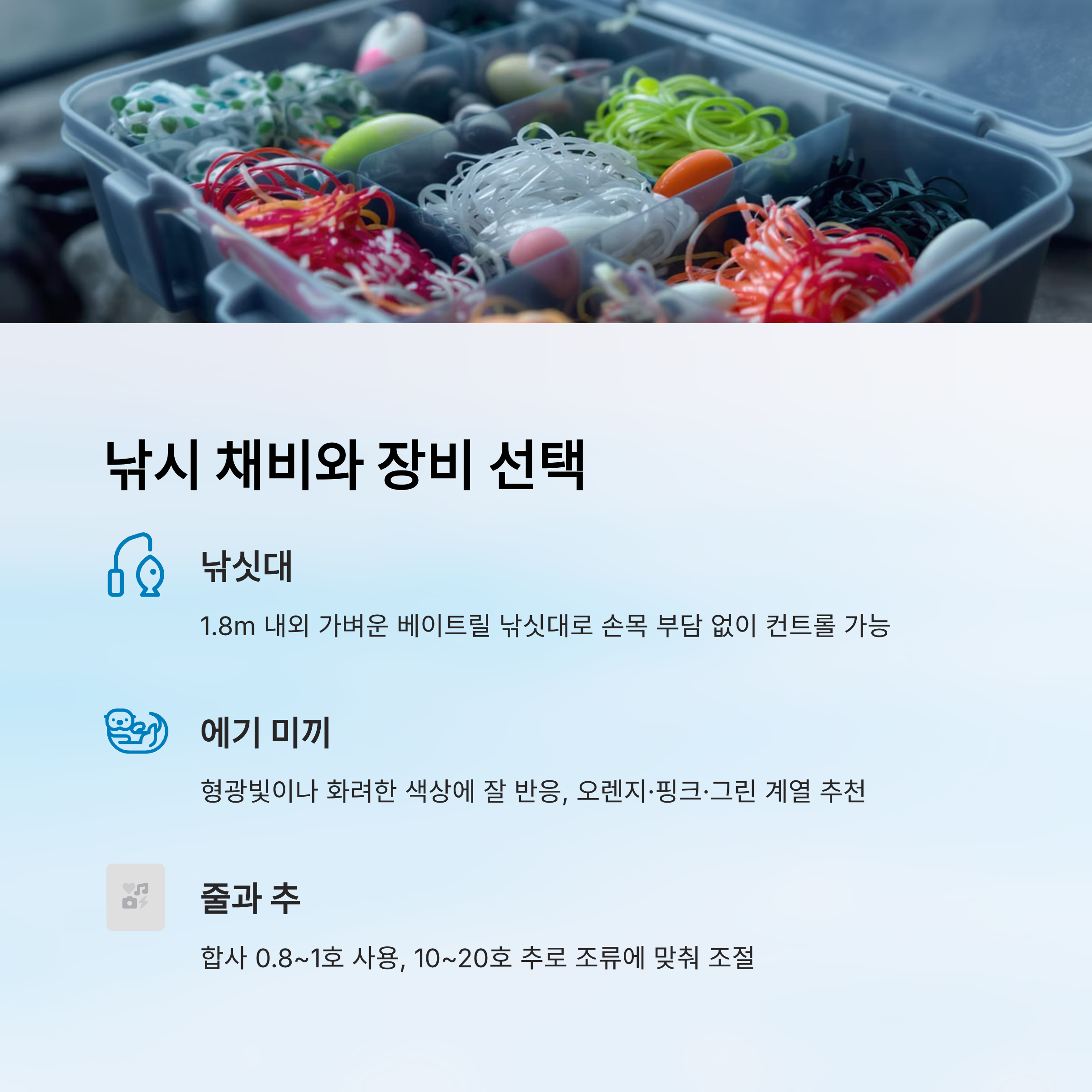 | 에기 | 2.5~3호 | 형광, 핑크, 오렌지 인기 | 여러 색상 준비 |