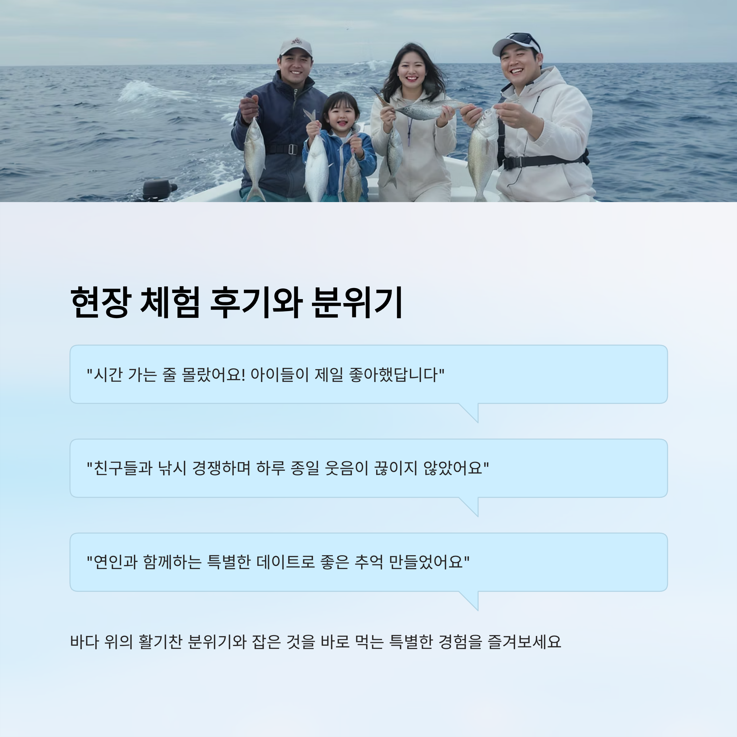 특히 가족 단위로 오는 경우 아이들이 제일 좋아해요. 작은 쭈꾸미가 올라오면 손바닥에 올려놓고 신기해하는 모습이 귀엽고, 부모님은 그런 아이들을 보며 사진을 찍느라 바빠요. 친구들과는 낚시 경쟁을 하면서 웃음이 끊이지 않는데, 누가 더 많이 잡았는지 비교하며 하루 종일 흥이 넘쳐요. 연인들은 바다 위에서 함께하는 특별한 데이트로 좋은 추억을 만들 수 있어요.