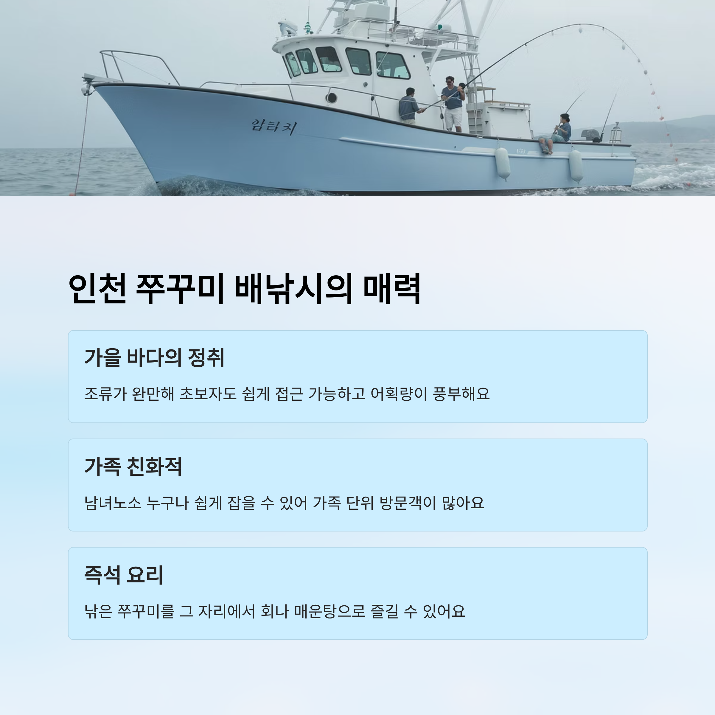 쭈꾸미 배낚시는 단순히 물고기를 잡는 체험이 아니라 바다의 풍경, 선상에서 먹는 회와 매운탕, 그리고 함께하는 사람들과의 시간이 어우러져 특별한 추억을 선물해줘요. 내가 생각했을 때 도시 근교에서 이런 힐링을 즐길 수 있다는 게 인천 낚시의 가장 큰 장점 같아요.