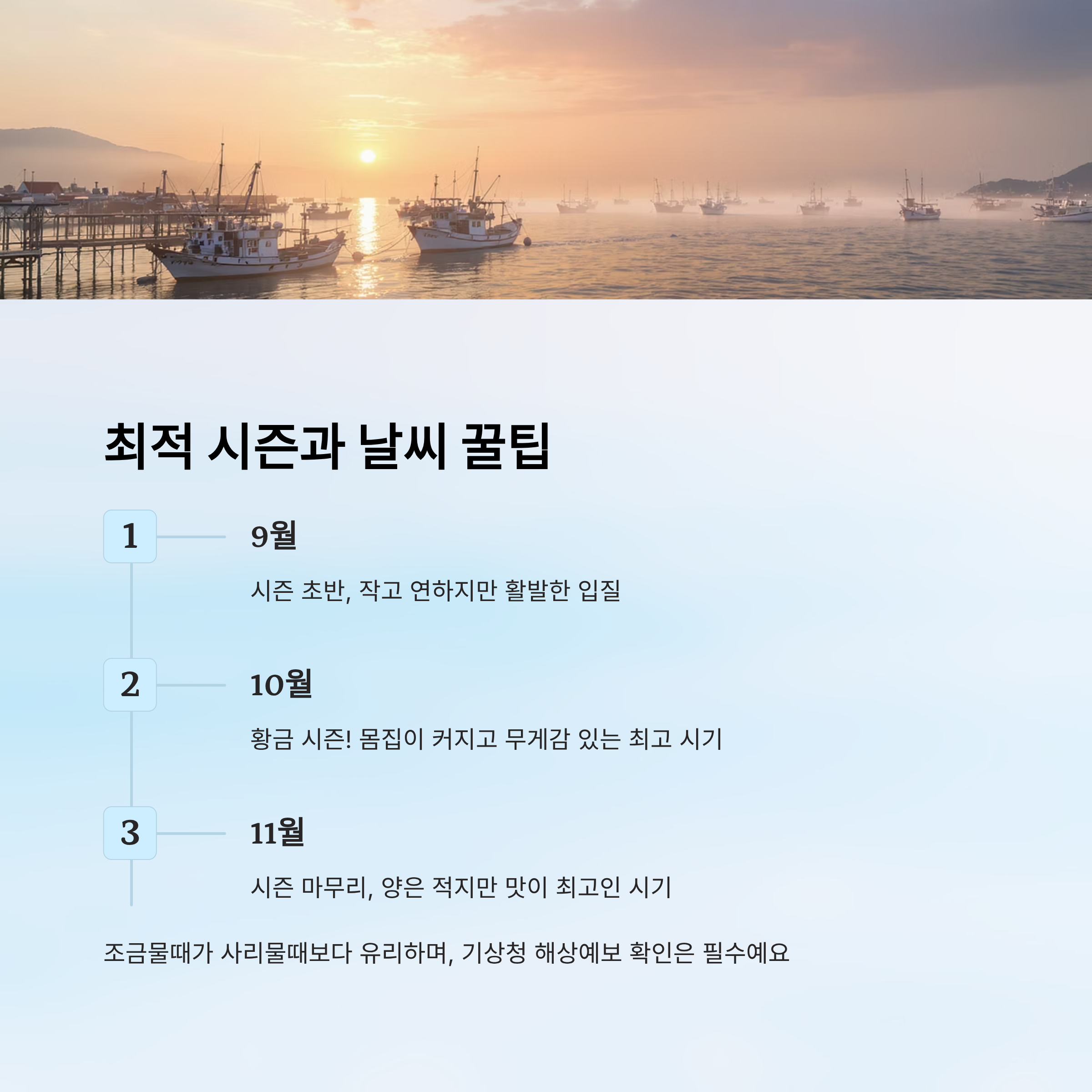 표에서 보듯 10월이 가장 이상적인 시기예요. 하지만 9월이나 11월에도 충분히 손맛을 느낄 수 있어요. 중요한 건 물때와 날씨를 잘 맞추는 것이니, 출조 전 준비를 철저히 한다면 언제든 즐거운 낚시가 가능하답니다. 🌅