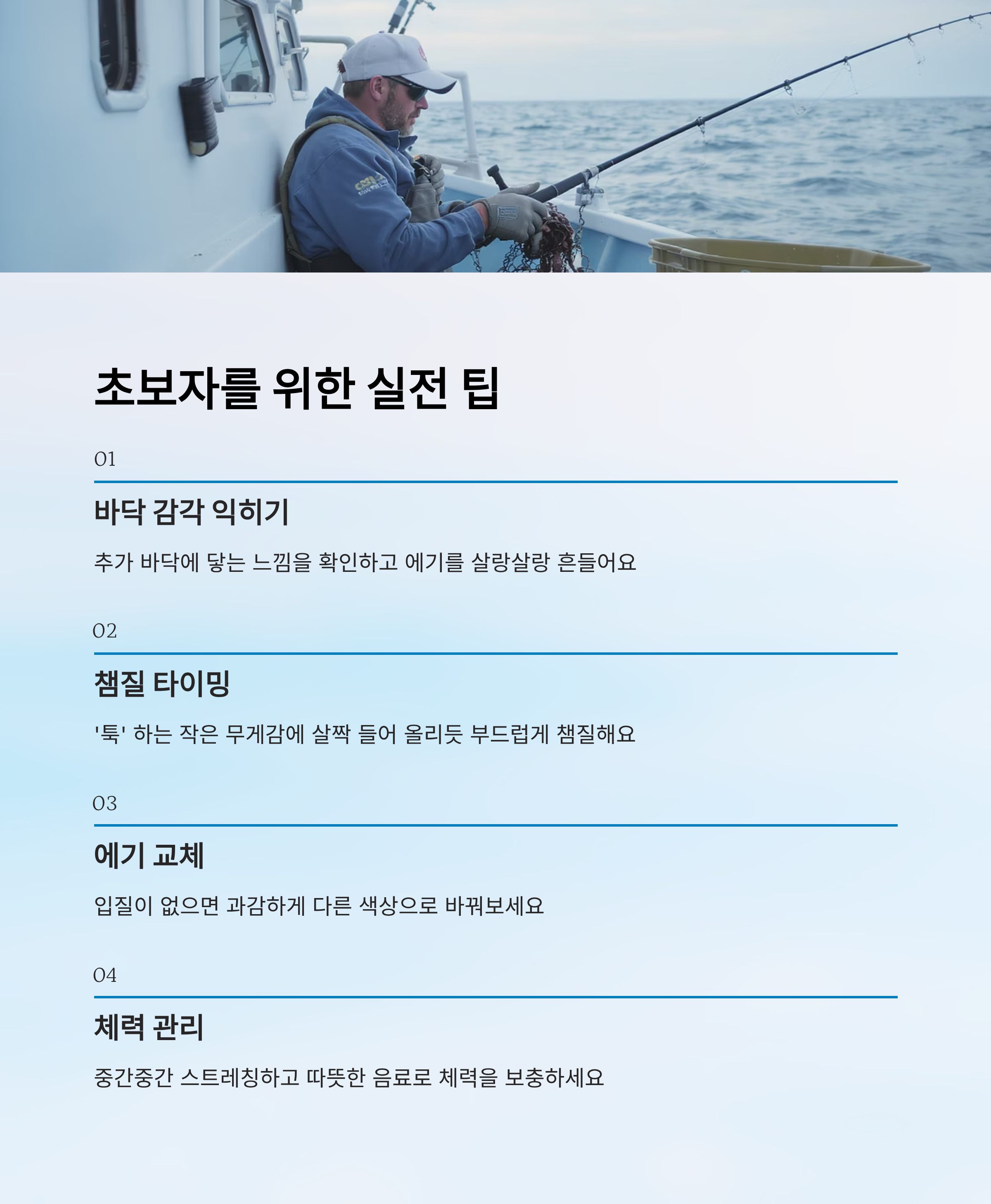 네 번째는 체력 관리예요. 배 위에서 몇 시간 동안 낚싯대를 들고 있으면 팔과 손목에 피로가 쌓여요. 따라서 중간중간 스트레칭을 하고, 간단한 간식을 준비해 두는 게 좋아요. 바닷바람은 생각보다 체력을 빨리 소모하게 하니 따뜻한 음료도 챙기면 도움이 돼요. 🍵