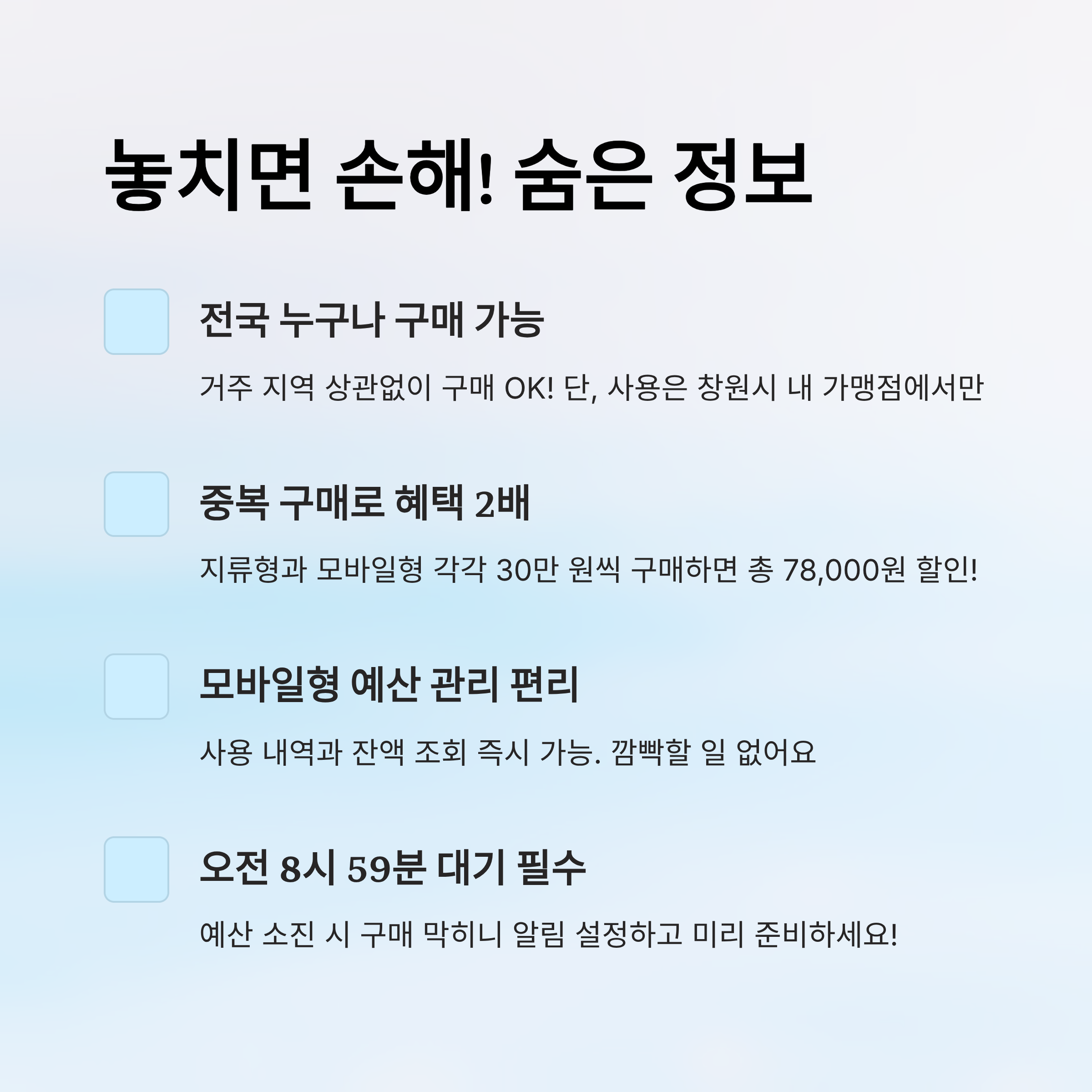 ⚠ 본 문서의 내용은 2025년 9월 기준이며, 실제 판매 일정과 조건은 창원시청 공지사항 및 누비전 공식 채널을 통해 확인해주세요.