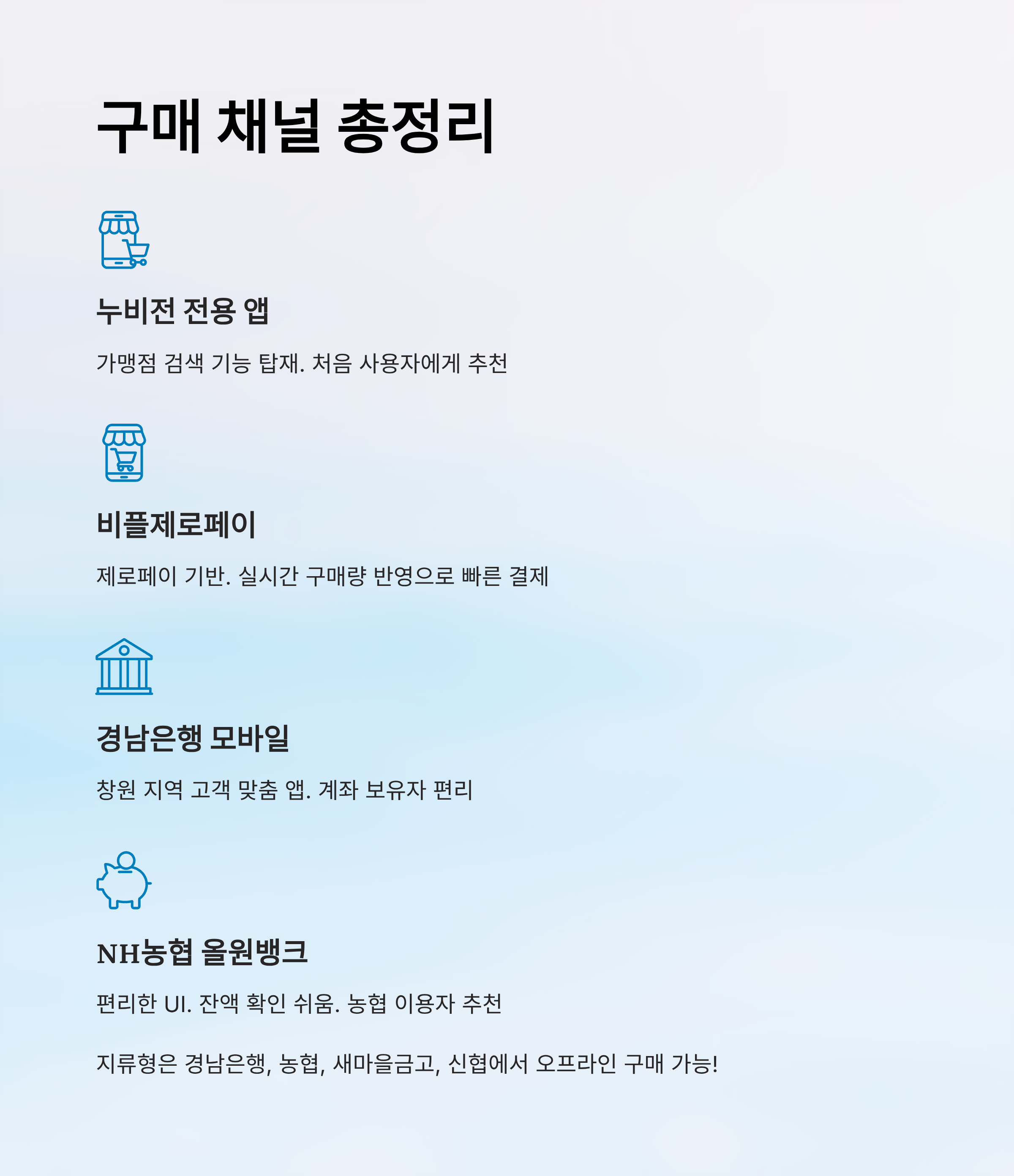 대표적인 구매 채널로는 누비전 전용 앱, 비플제로페이, 경남은행 모바일뱅킹, NH농협 올원뱅크 등이 있어요. 이 앱들만 깔아두면 언제든 손쉽게 누비전을 구매할 수 있어요. 📱