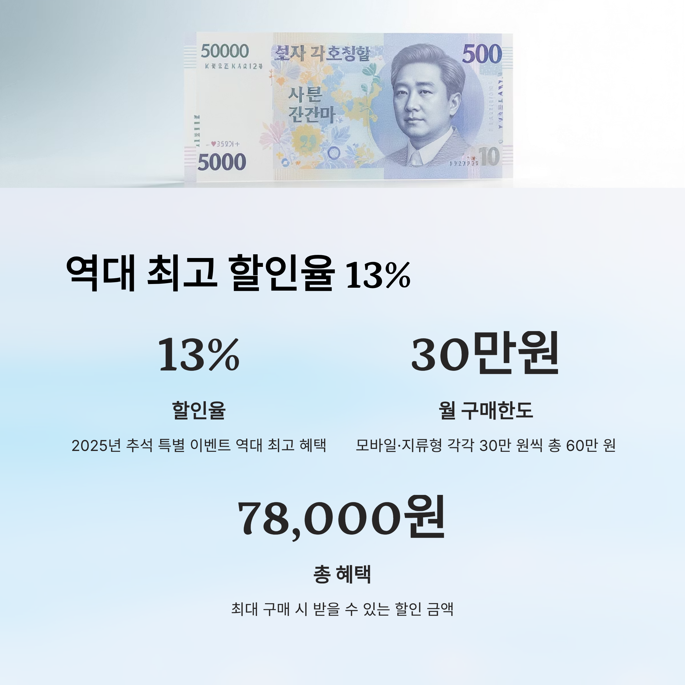 할인 적용 구매 한도는 모바일과 지류형 각각 1인당 월 30만 원까지예요. 즉, 총 60만 원 상당을 구매하면서 7만 8천 원</strong의 혜택을 받을 수 있는 셈이죠. 😲