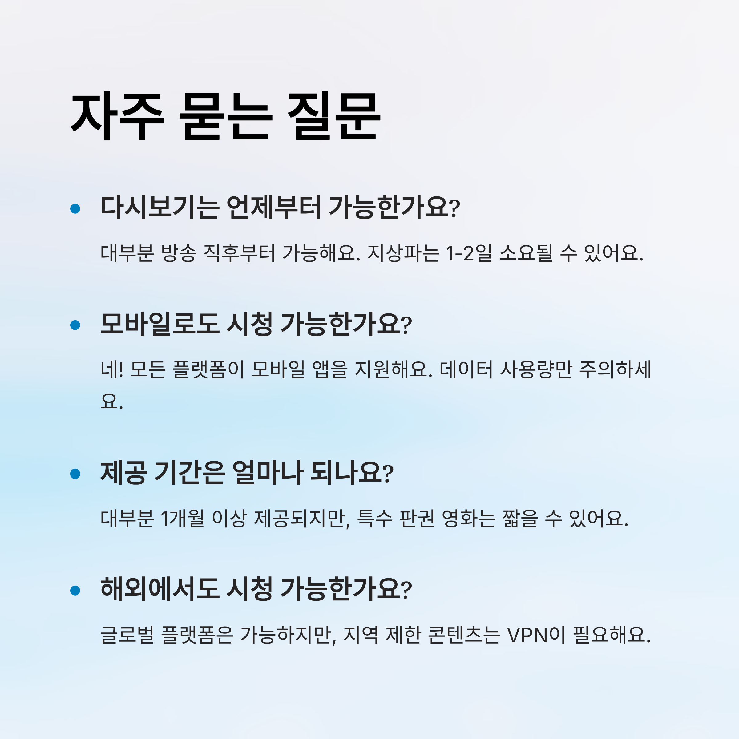 A1. 대부분 방송 직후부터 VOD 플랫폼에서 시청 가능해요. 넷플릭스, 티빙 등은 바로 올라오고, 지상파 VOD는 하루~이틀 정도 소요될 수 있어요.