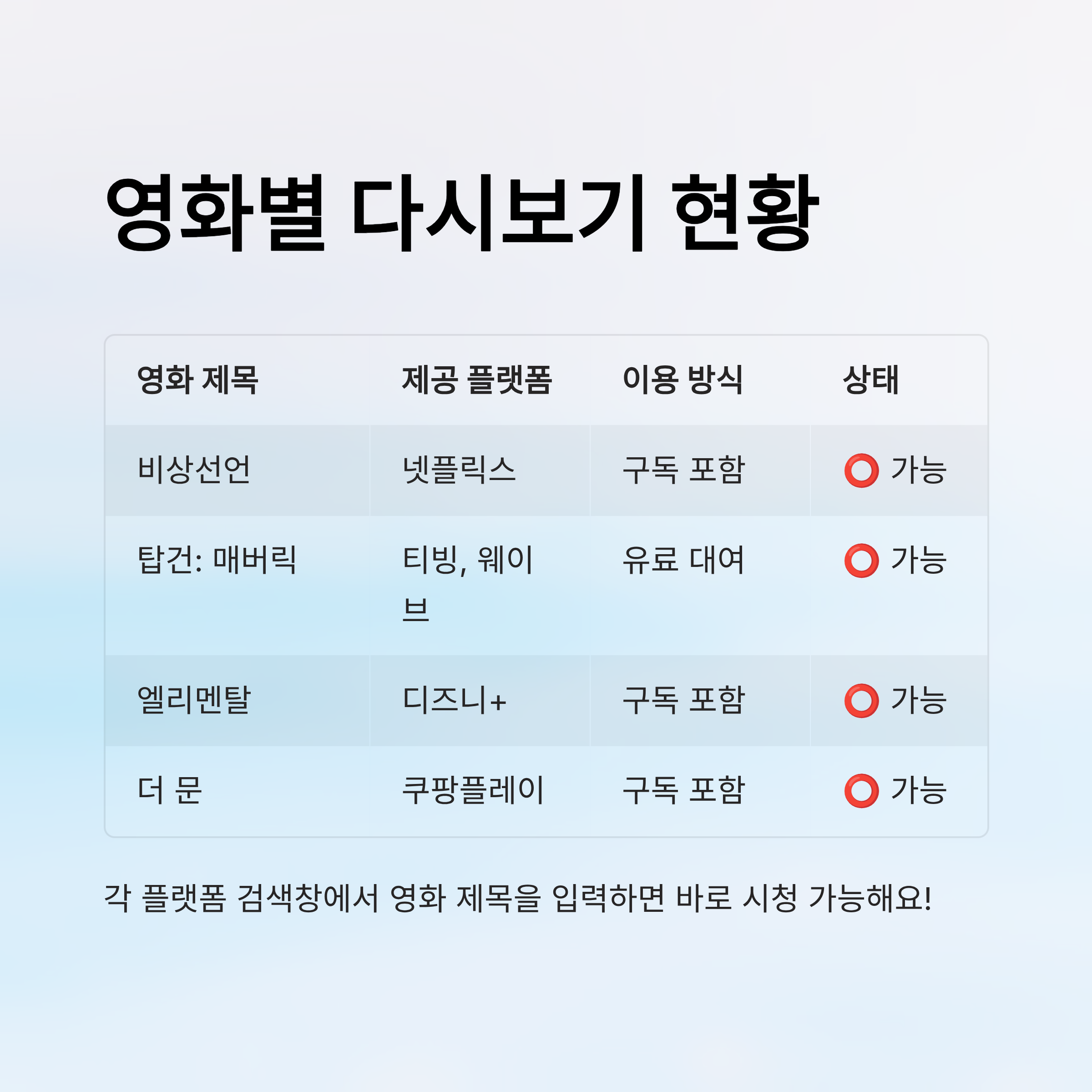 | 영화 제목 | 다시보기 가능 여부 | 제공 플랫폼 | 무료/유료 |